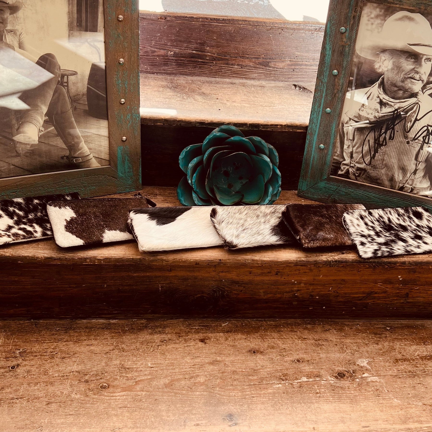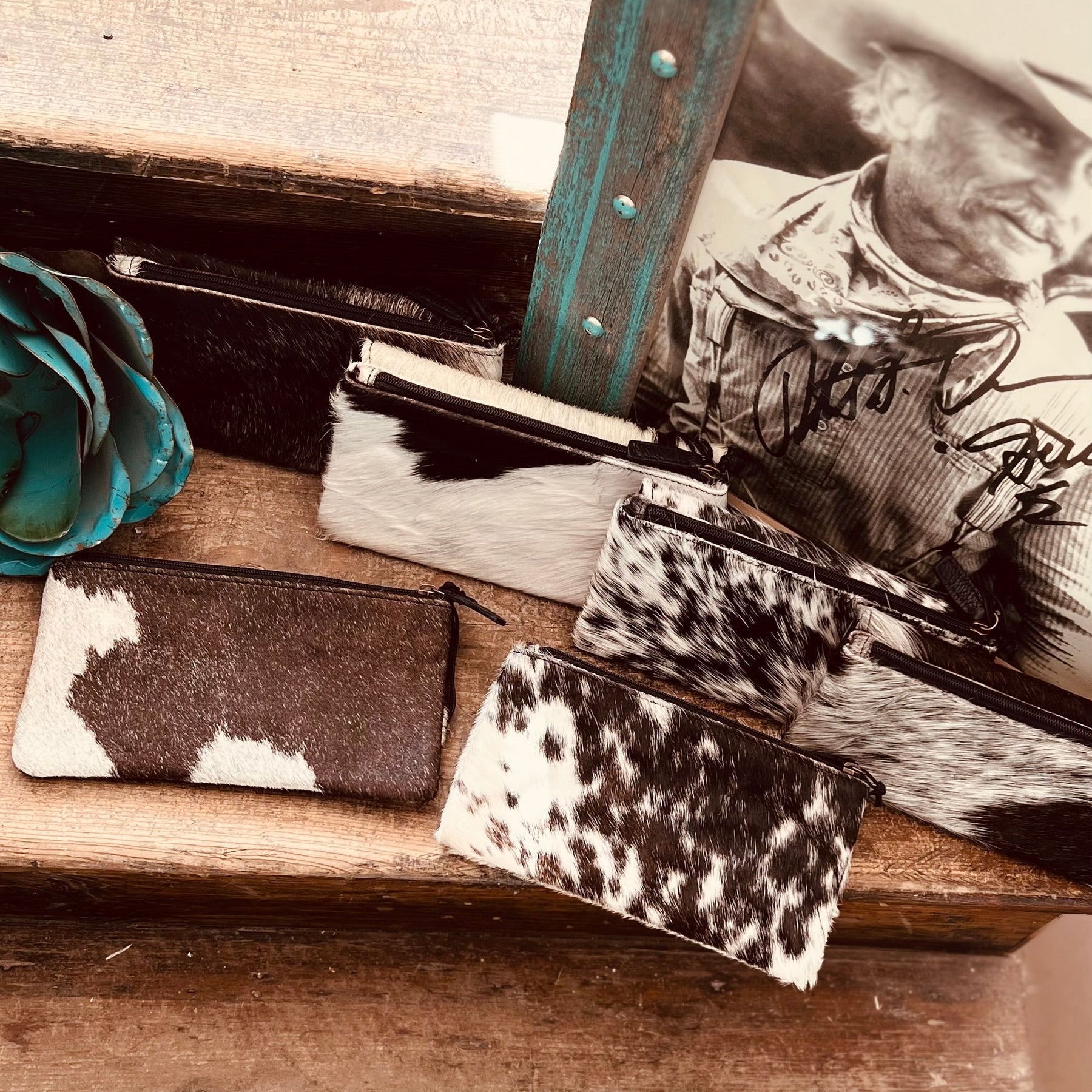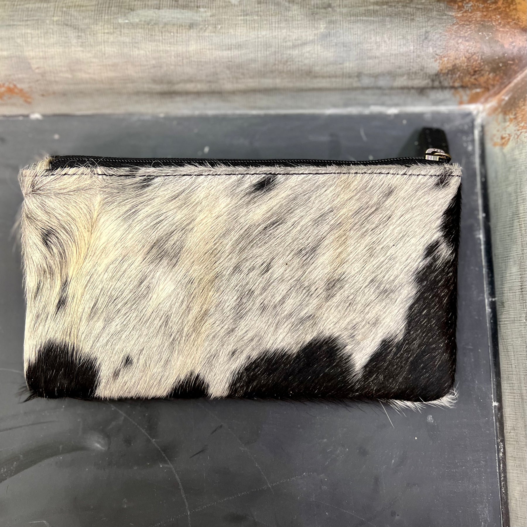 Black hair on hide wallet with two zipper pockets. Complete with ten card slots and secured with a button snap closure!