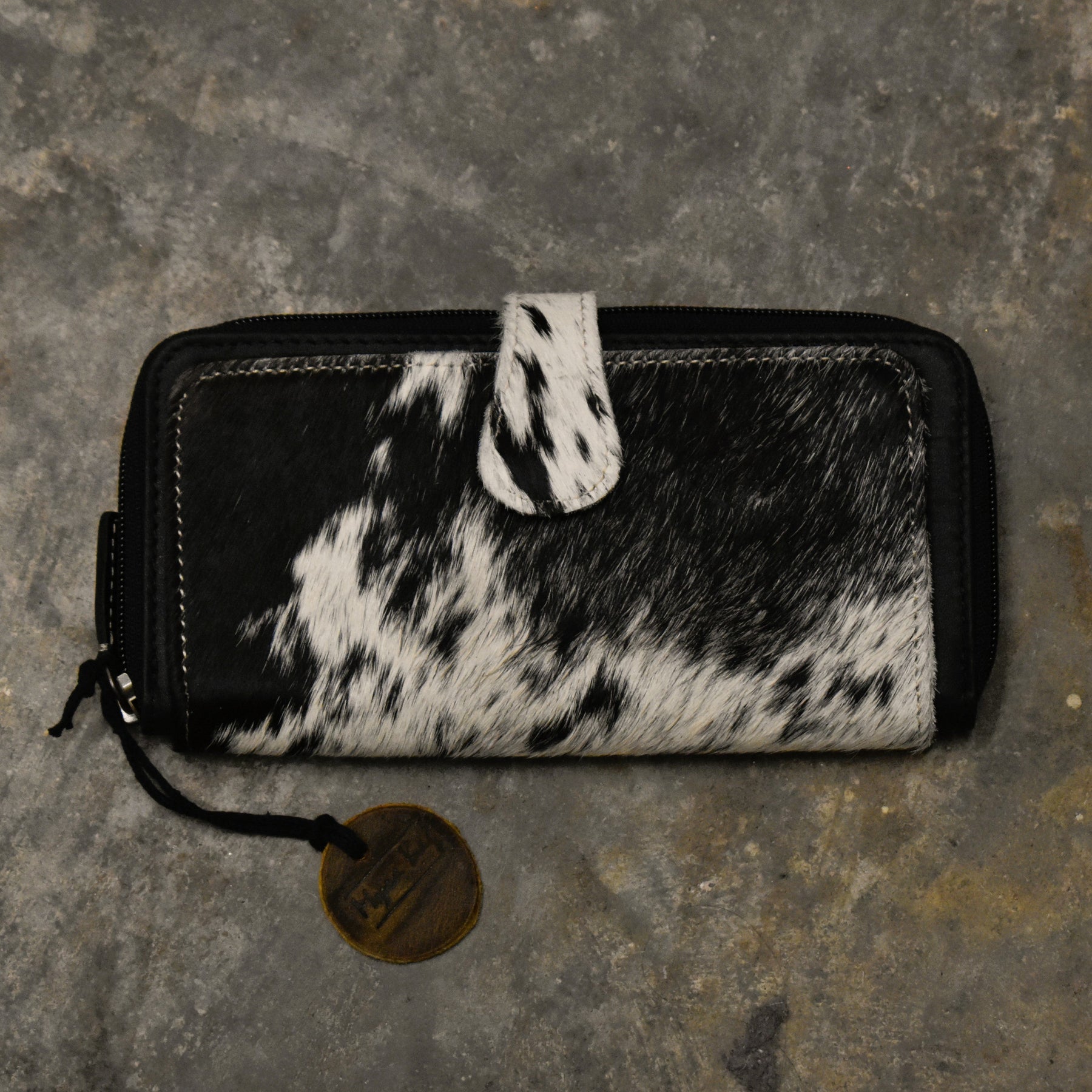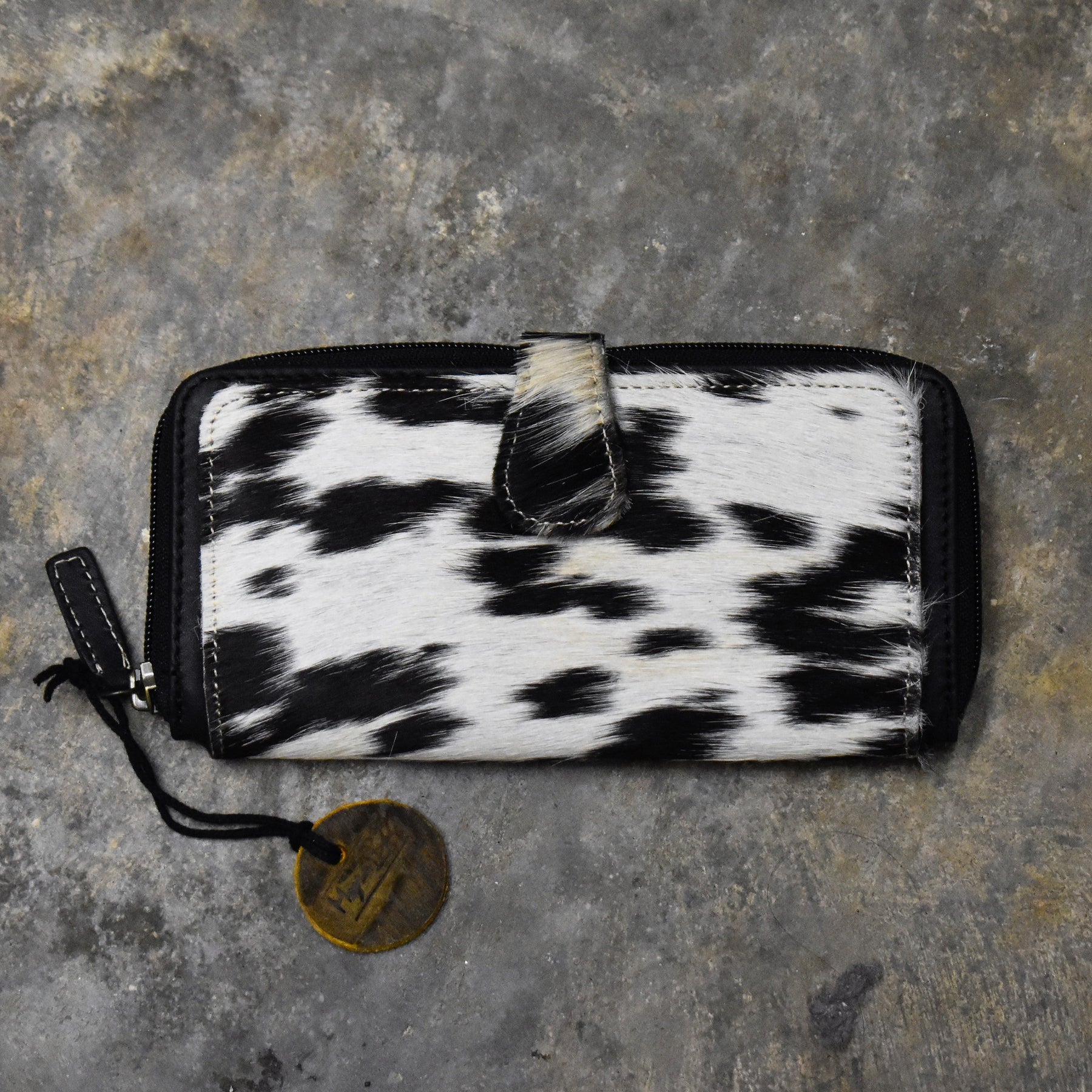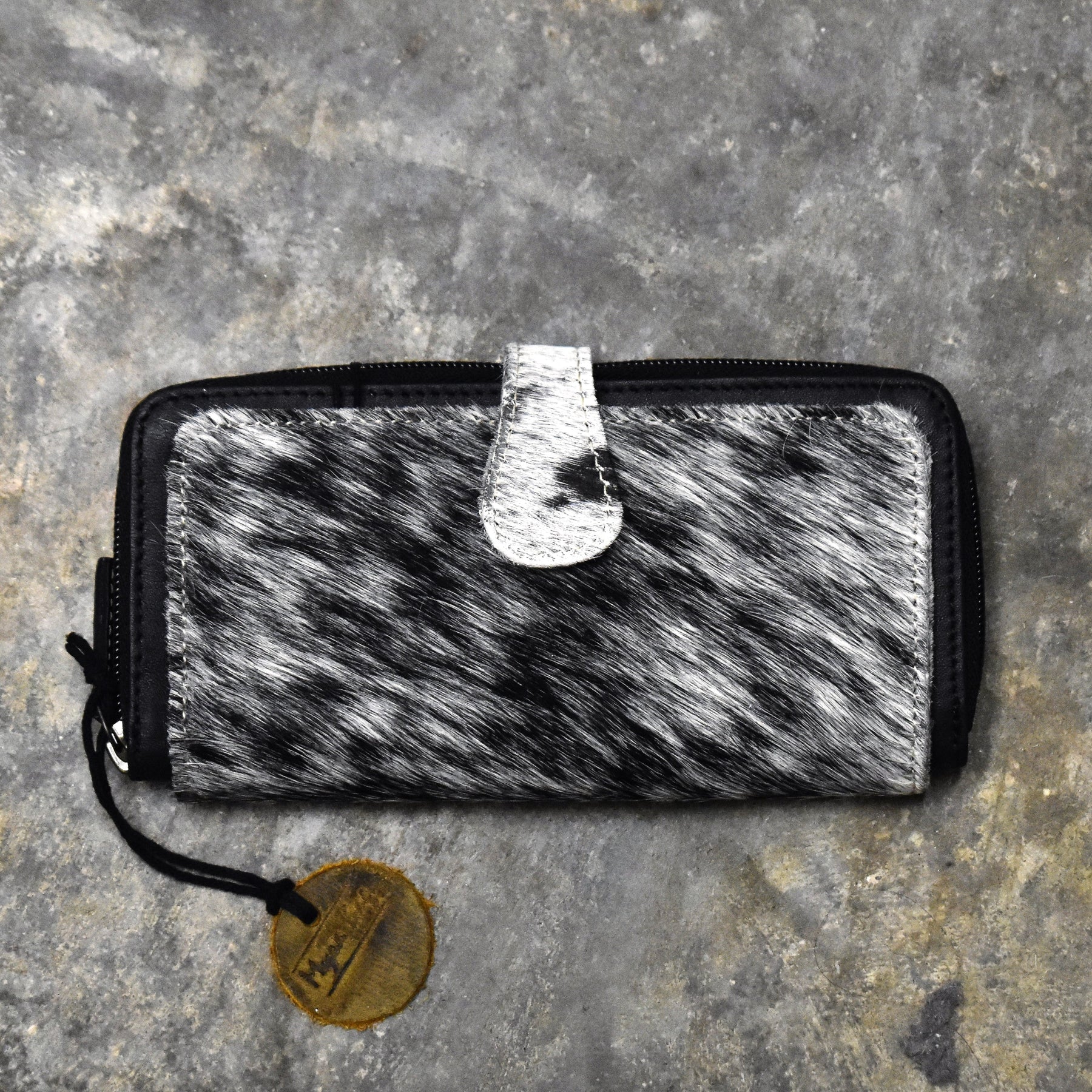 Black and white hair on hide wallet with fold over button closure closure, with 6 card slots.  This wallet also features an interior zipper pocket with an additional 12 card slots and a money pocket.