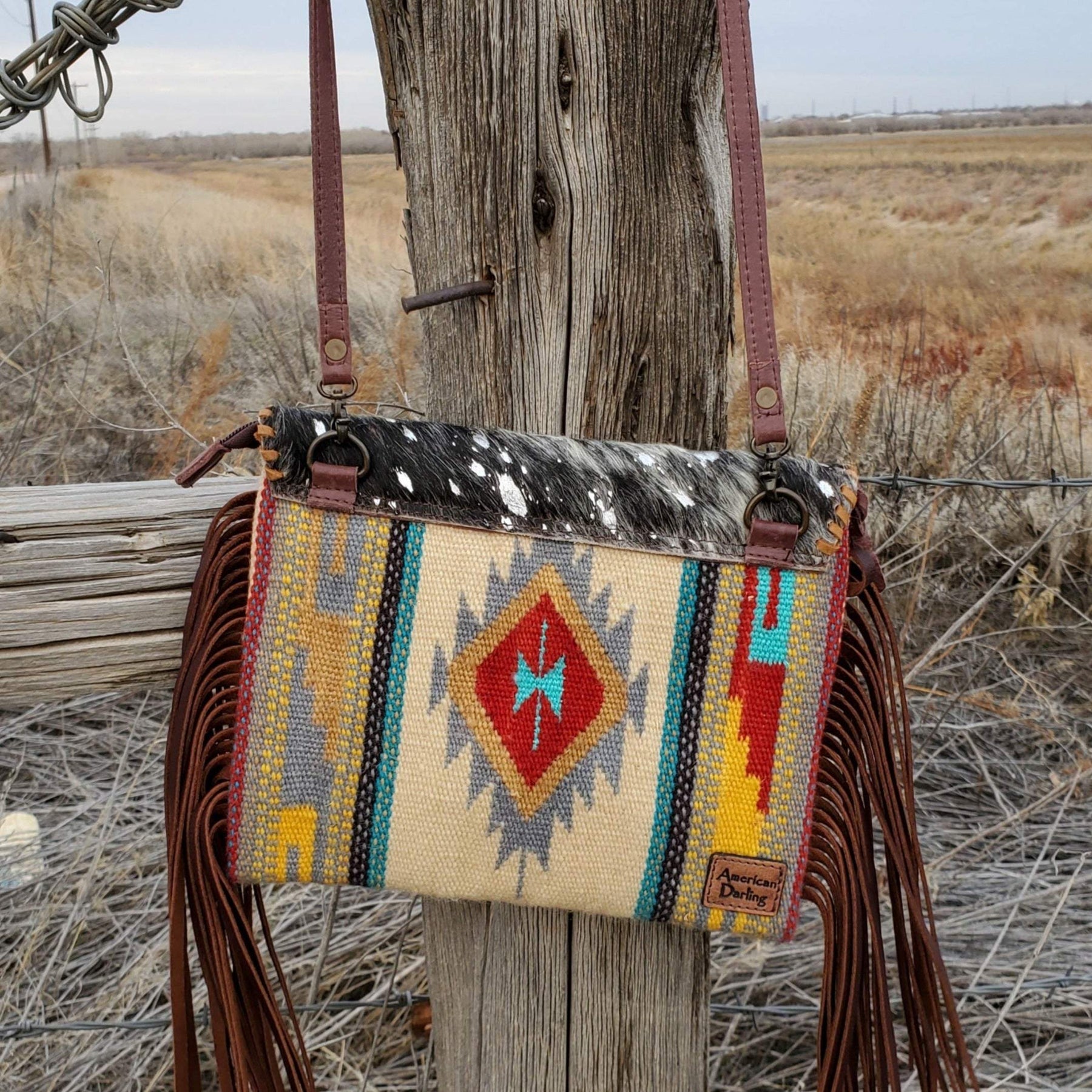 Shades of red, yellow and grey-blue Aztec saddle blanket cross-body featuring brown fringe on the sides. Fold over flap in hair on hide with metallic silver speckles and lacing detail. Bag is zipper closure, small inside zipper pocket, small open pocket. Cross-body strap is adjustable and removable.
