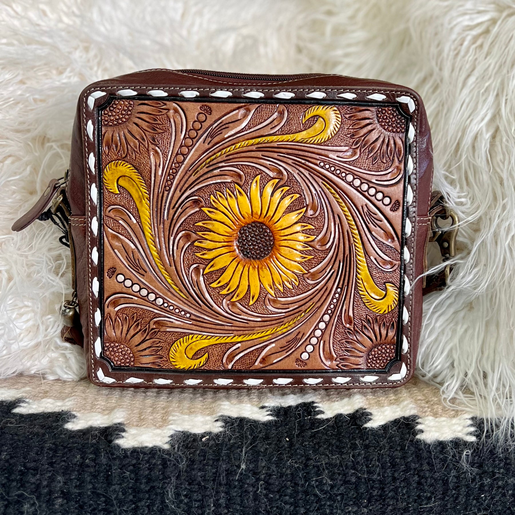 Add some spunk to any outfit with this unique Radiant Sunflower Bag! Crafted leather and feature hand-tooled sunflowers, a zipper closure, shoulder strap, and it features an enjoyable western style with whipped stitching. Unleash your inner cowgirl and show off your sunflower style!