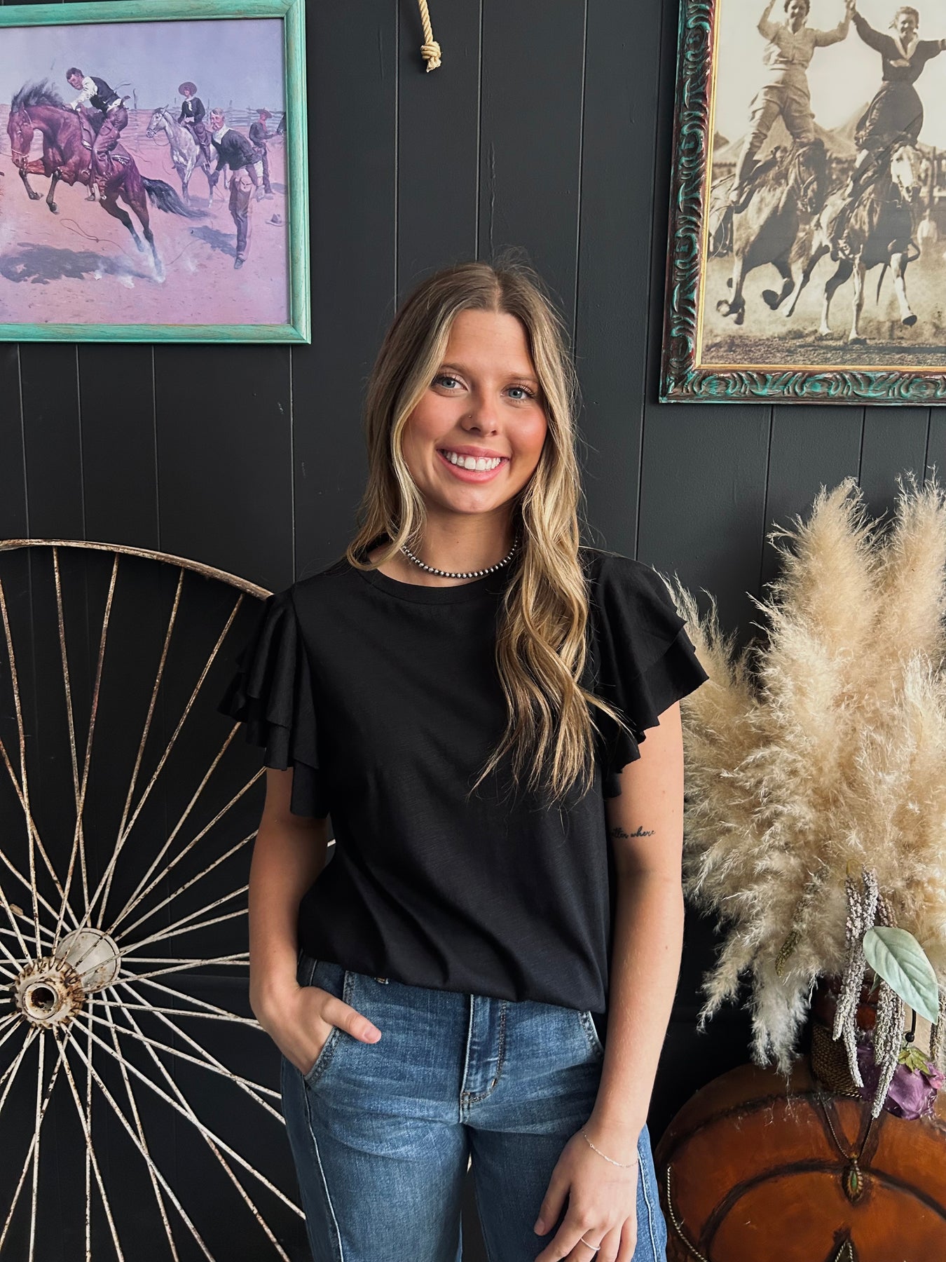 Add some flair to your wardrobe with this Western Layered Ruffle Top. Featuring a whimsical layered and ruffled design, this short sleeve top will make any outfit pop. The round neck adds a touch of class, making it perfect for any occasion. Available in 3 colors. Upgrade your style game now!