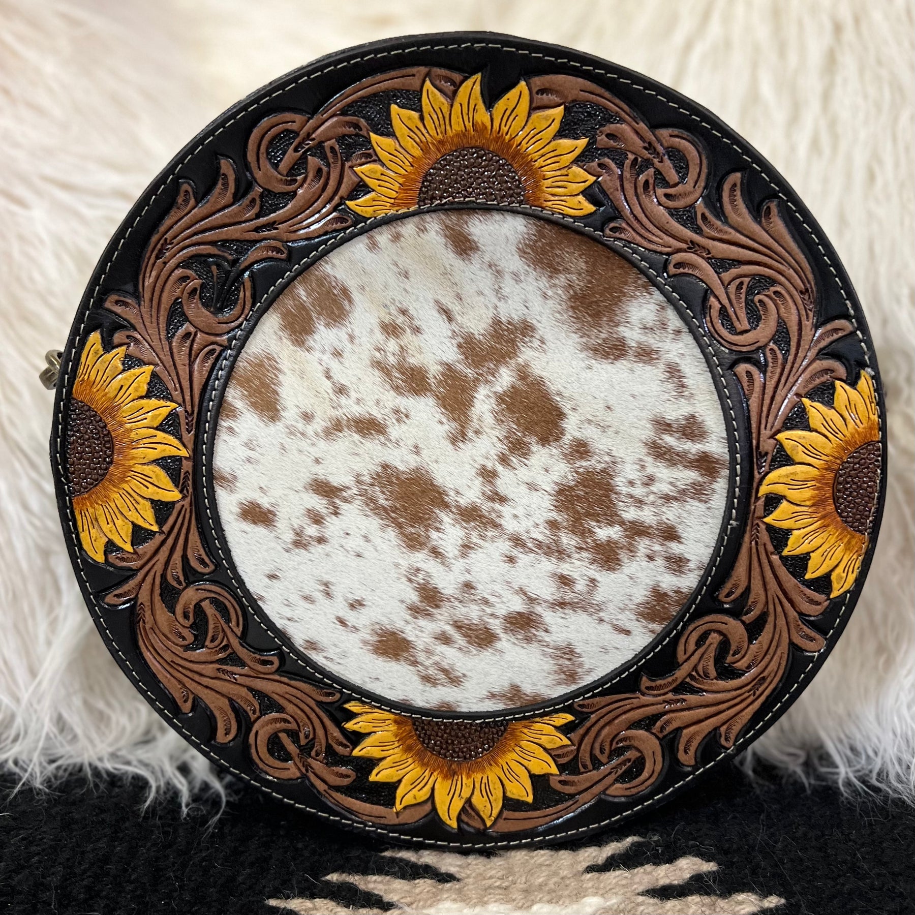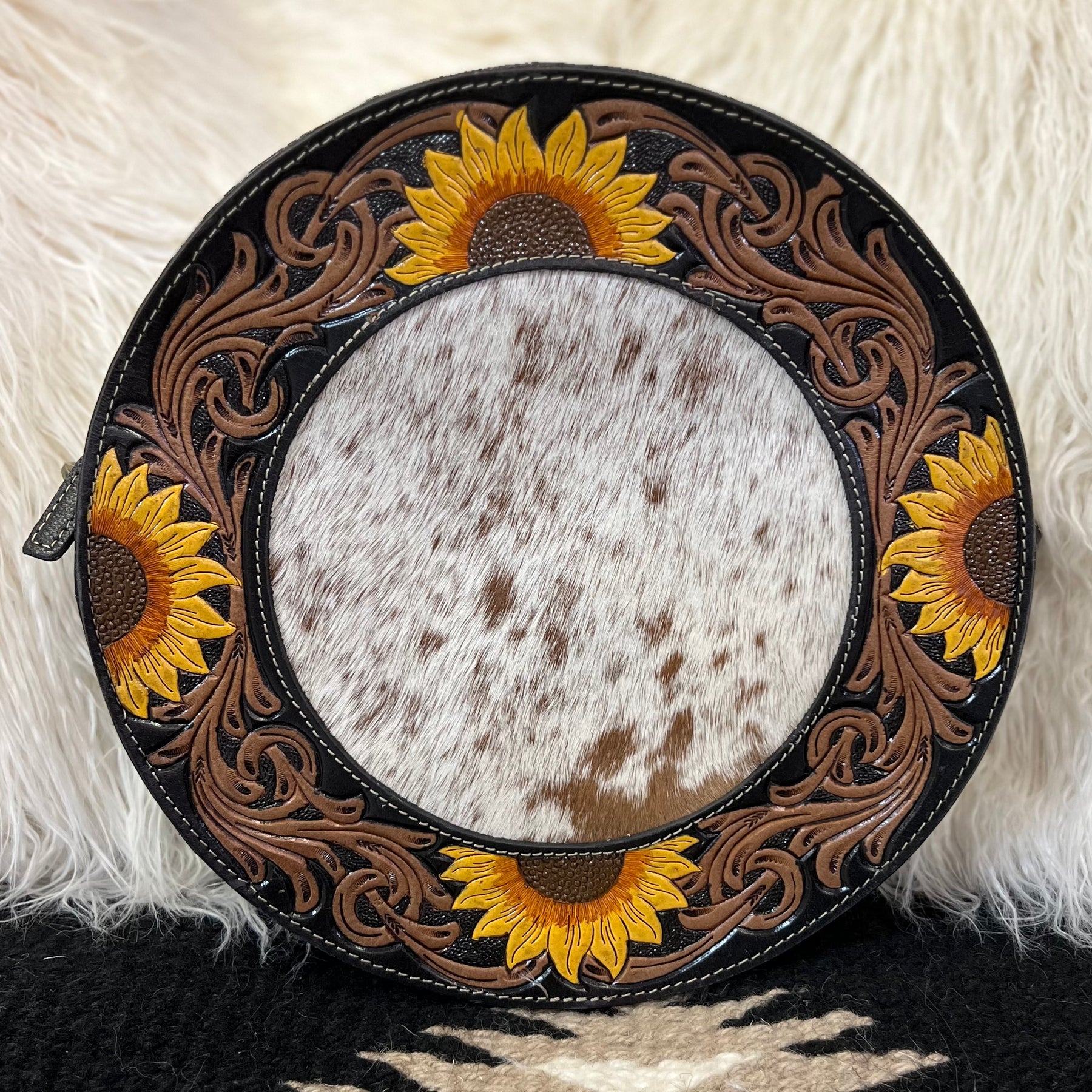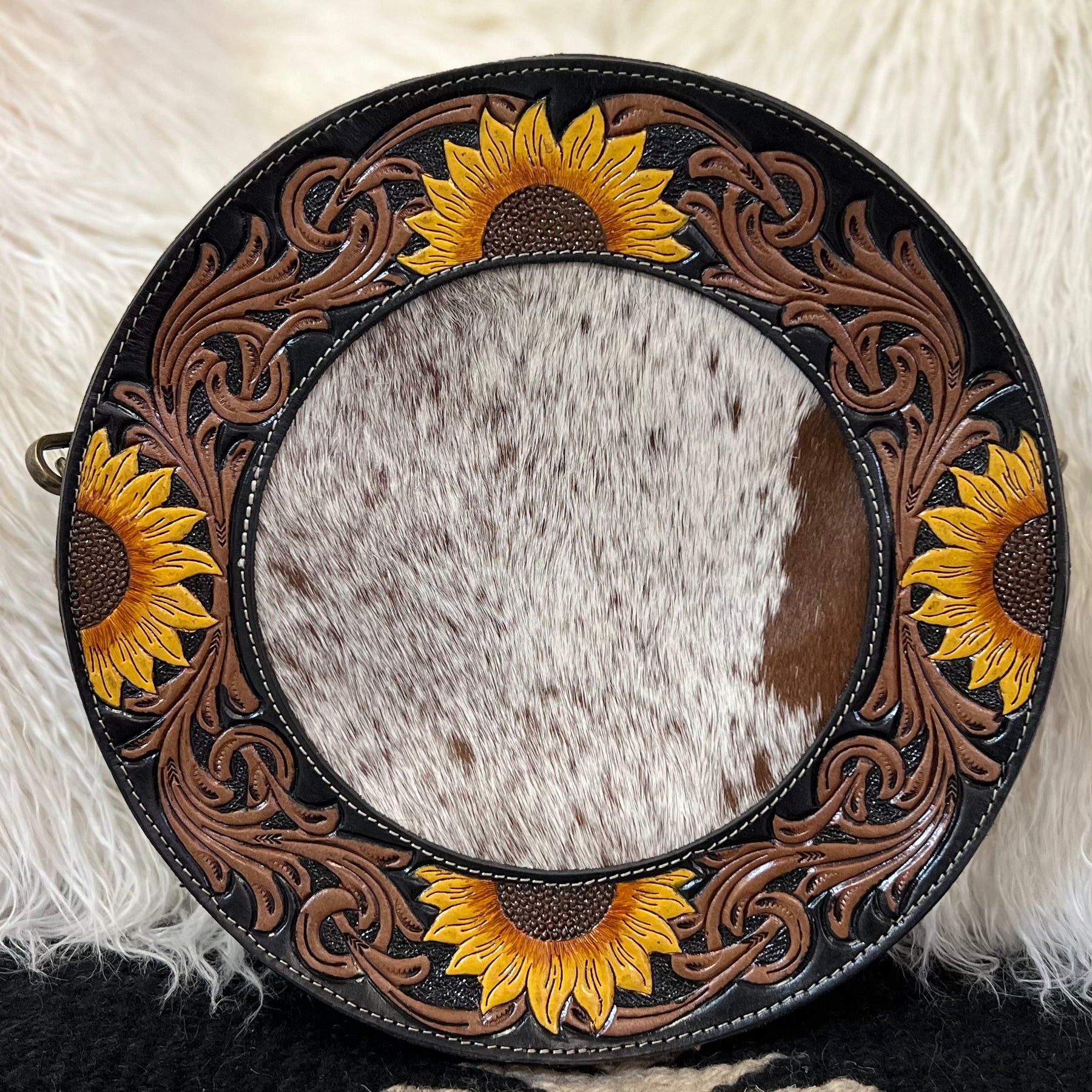 The Canteen In a Blooming Field Bag is a 10" round Hair On Hide with Beautiful Sunflower Tooled Black Leather Accents. The bag features a 3/4 zipper closure and a small zipper closure on the back. The bag features 2 different cowhide variants.