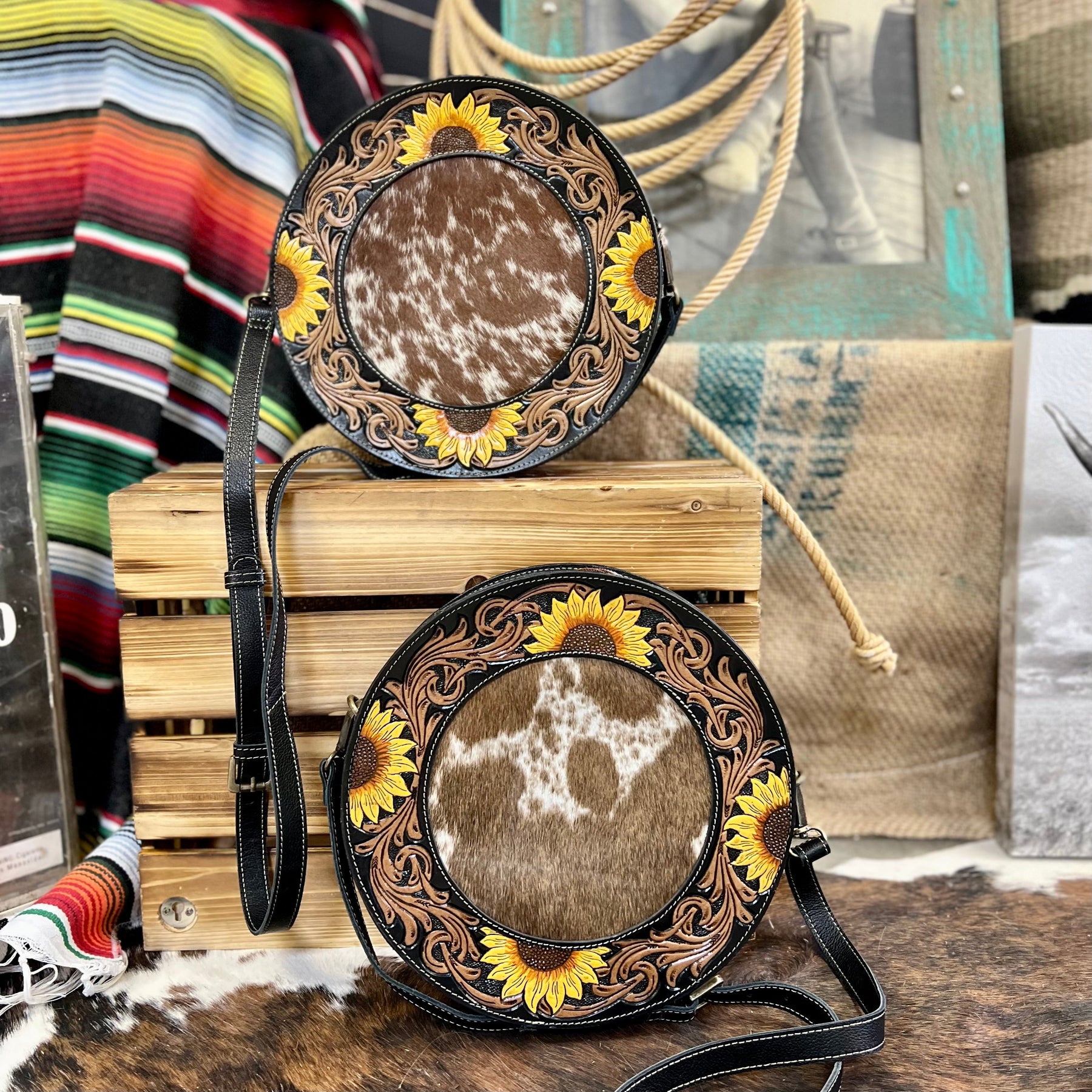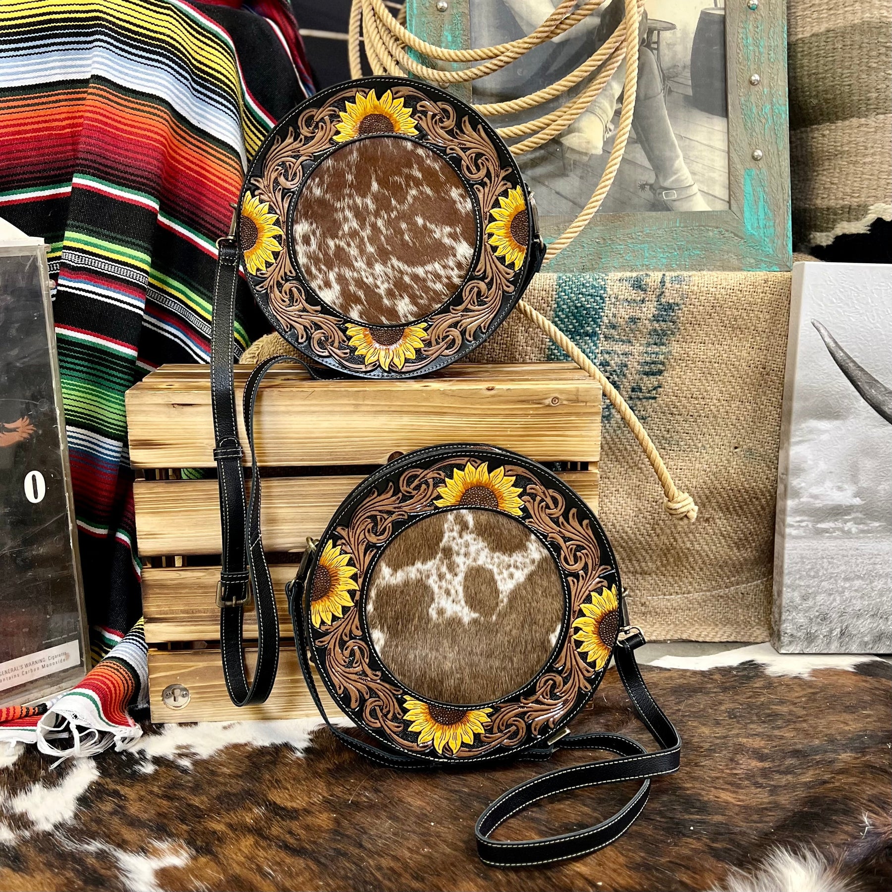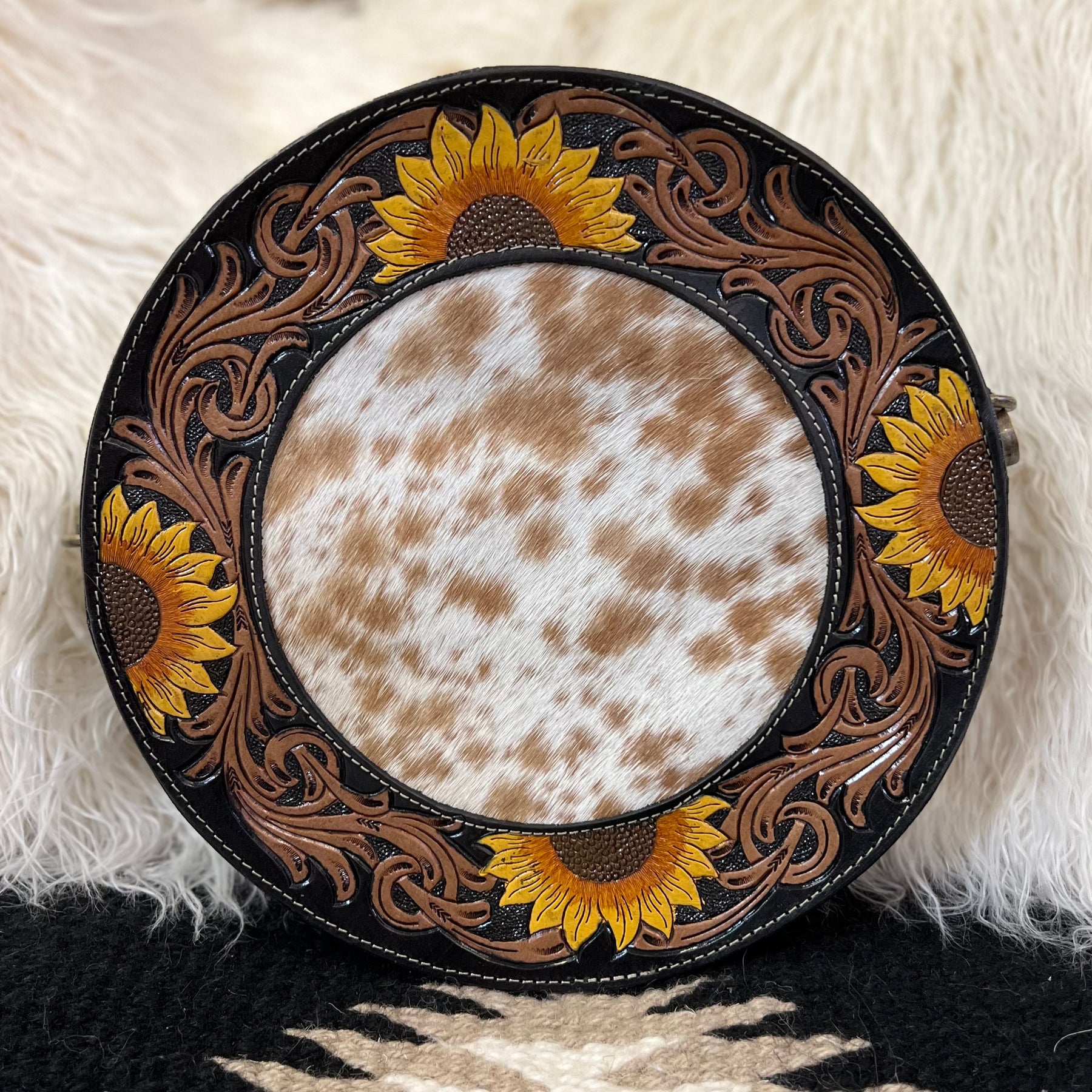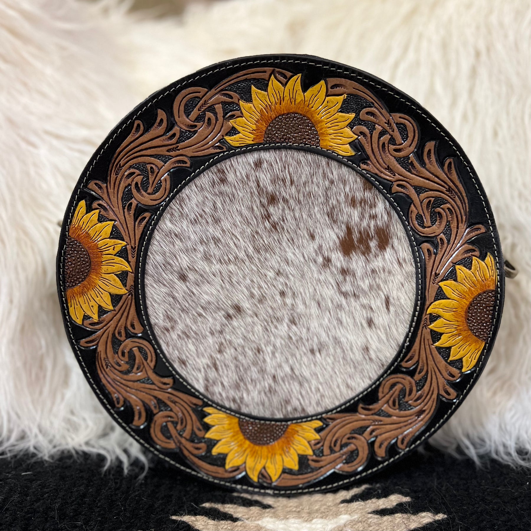 The Canteen In a Blooming Field Bag is a 10" round Hair On Hide with Beautiful Sunflower Tooled Black Leather Accents. The bag features a 3/4 zipper closure and a small zipper closure on the back. The bag features 2 different cowhide variants.