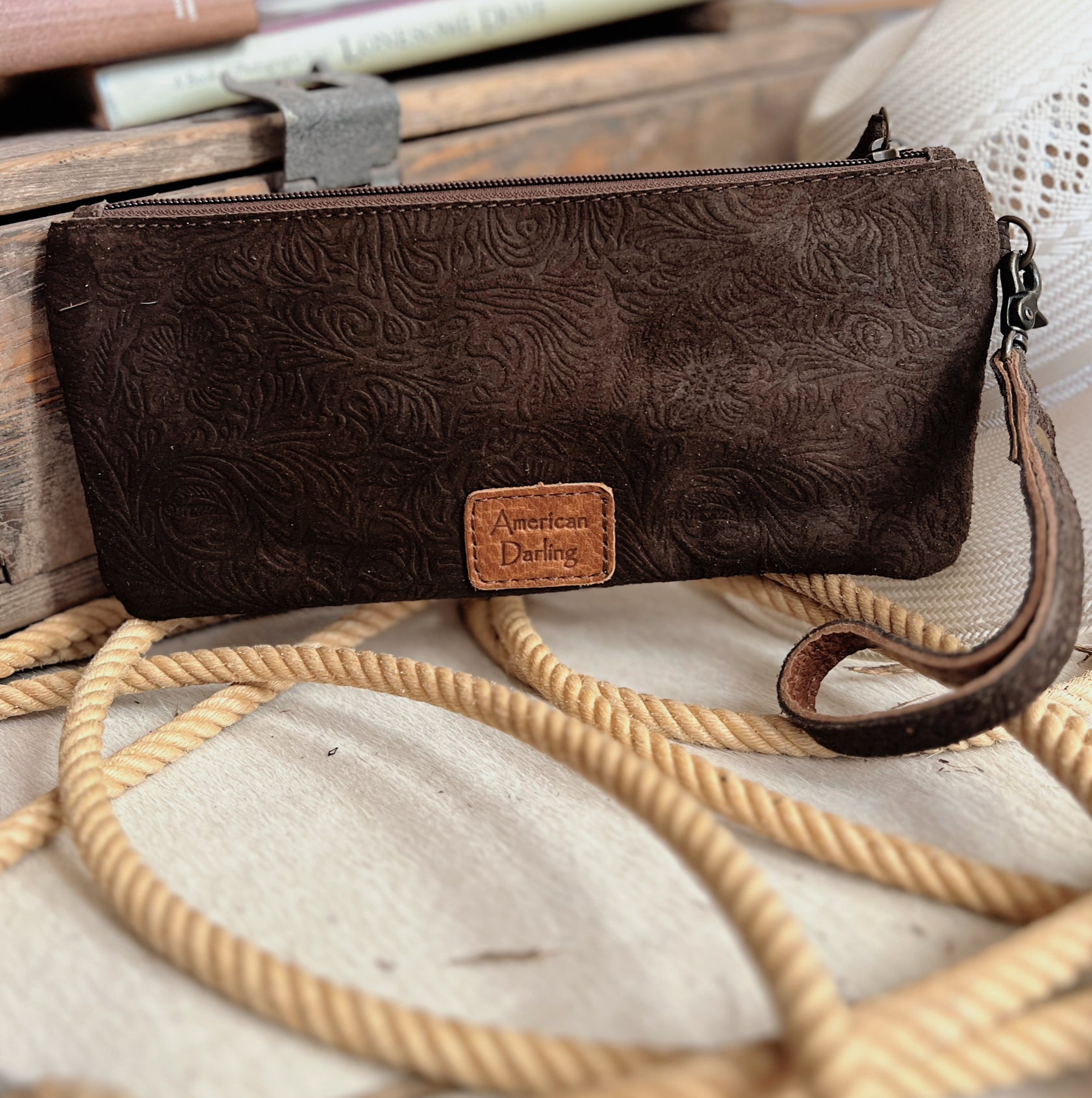 Get ready to hit the dance floor in style with our Darling Tooling Up The Dance Floor Wristlets! Made with genuine leather, featuring a tooled tan trim, whip stitching, and embossed suede body, this high quality wristlet can also be carried as a clutch. Perfect for a night out, it's both functional and fashionable.