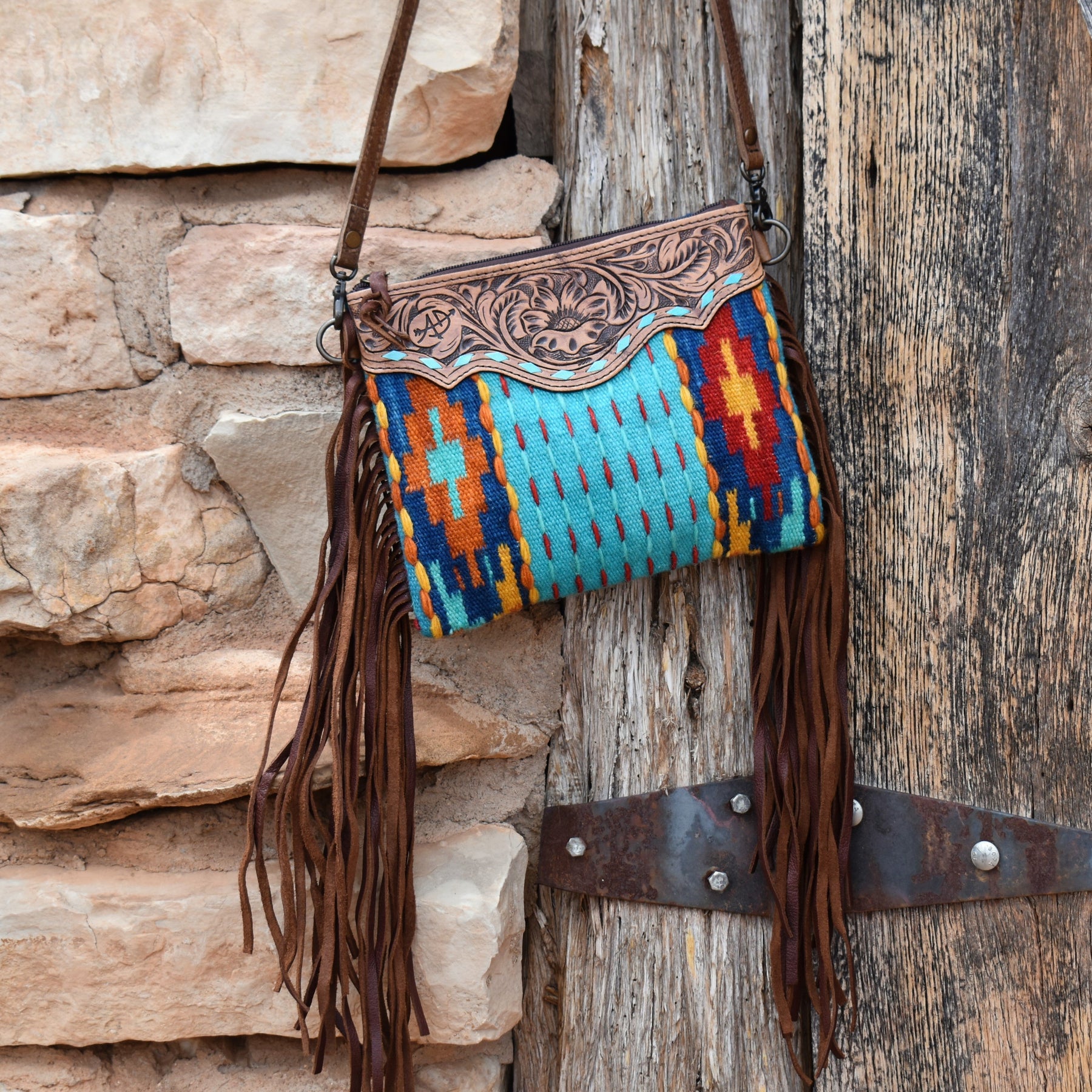 Beautiful and unique saddle blanket cross-body featuring brown leather fringe on the sides. Tooled leather front at the top showcasing a stunning sunflower motif. Bag is zipper closure, with small inside zipper pocket, small open pocket. Cross-body is strap is adjustable and removable.