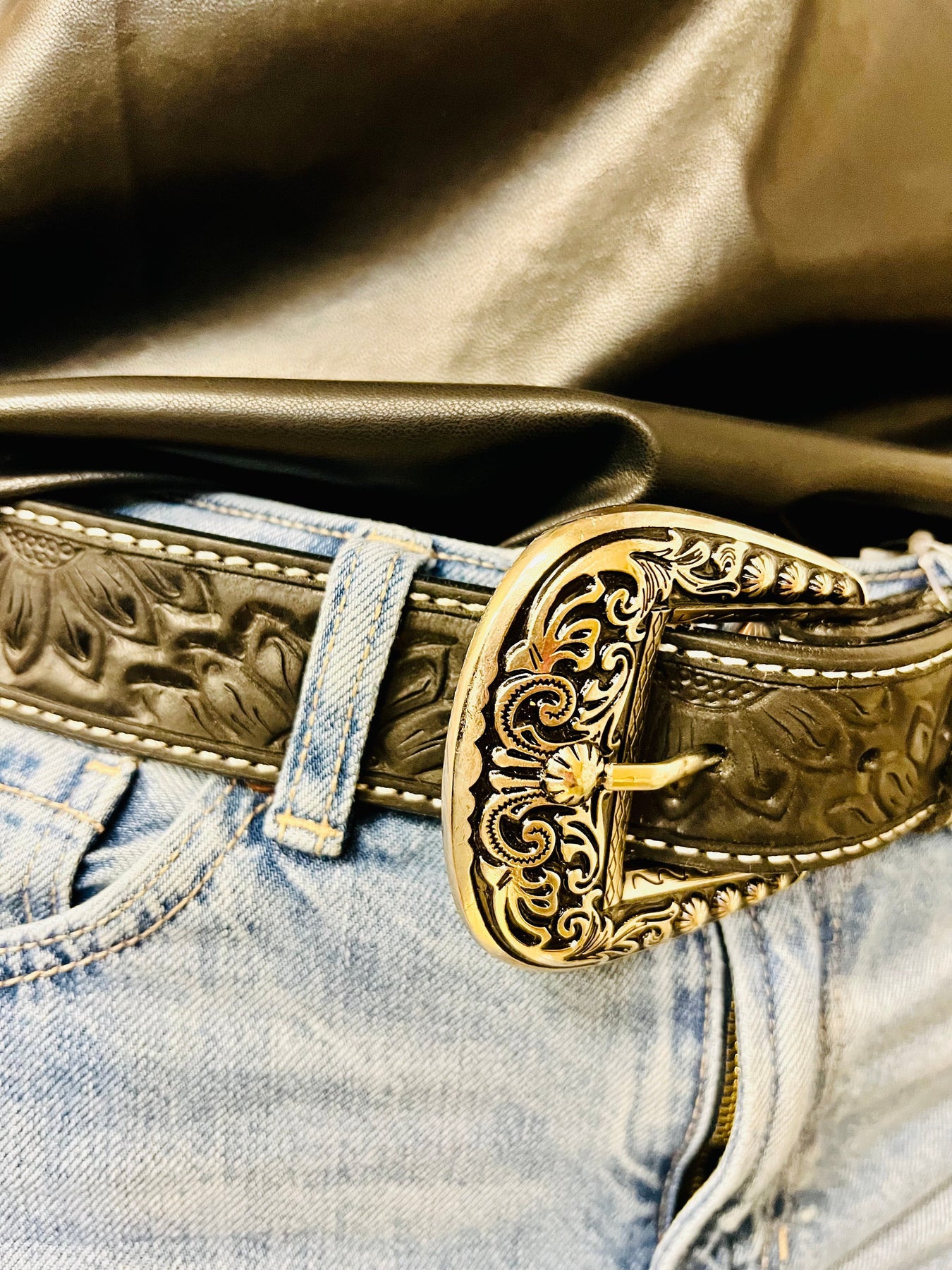 This black tooled leather belt features a detailed sunflower design and a silver tooled belt buckle. Made to be durable and long lasting, this belt is a stylish and functional addition to any wardrobe.
