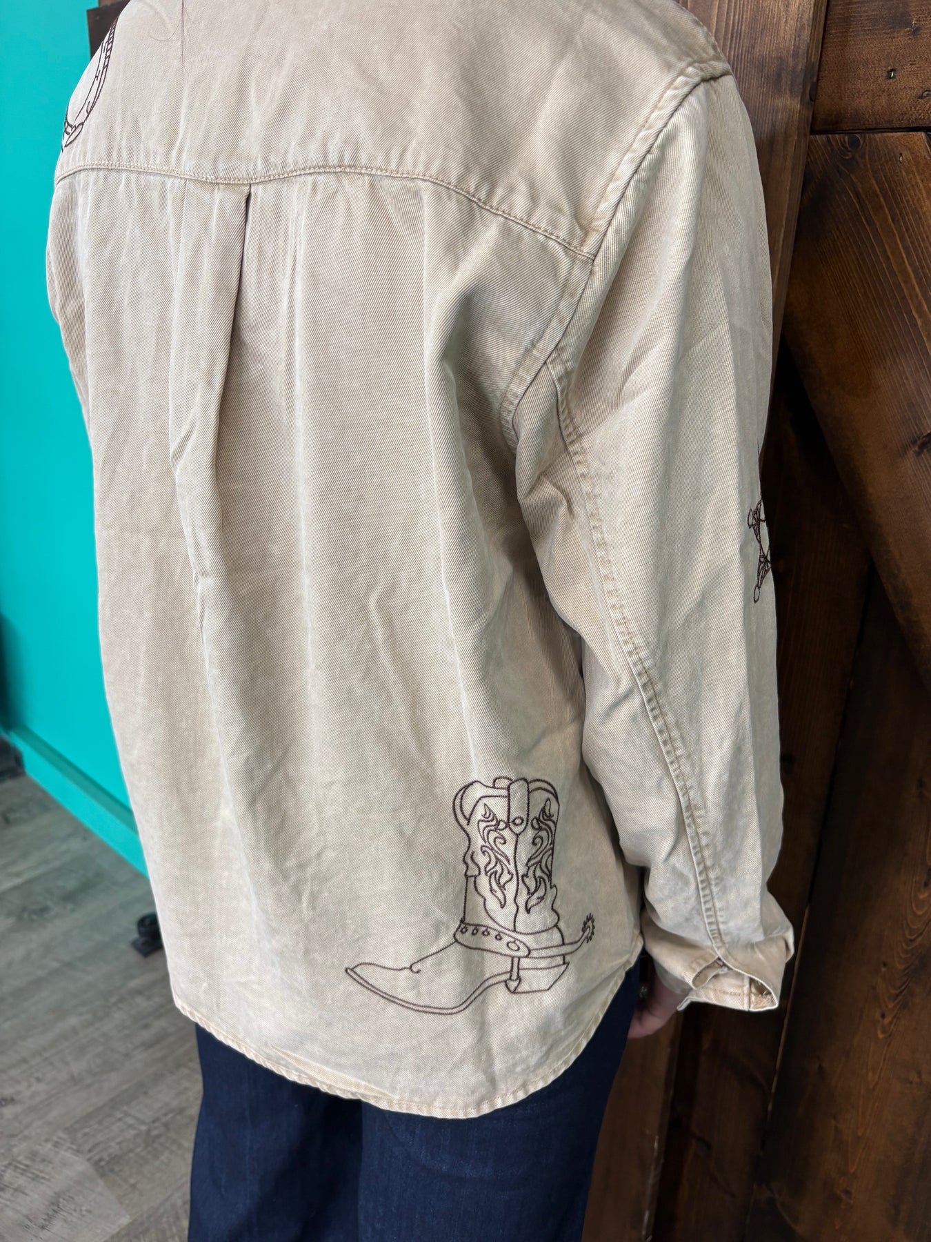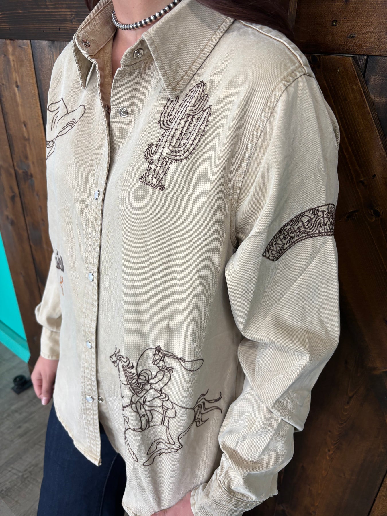 Add a touch of vintage charm to your wardrobe with this taupe Western embroidered snap button top. Made from a soft, mineral-washed blend of 80% Lyocell and 20% Cotton, it’s comfortable and breathable for all-day wear. Featuring a classic collar, long sleeves, and pearl snap buttons, this playful piece brings a fresh twist to a timeless Western style. Perfect for adding rustic flair to your casual looks with a hint of rugged elegance.