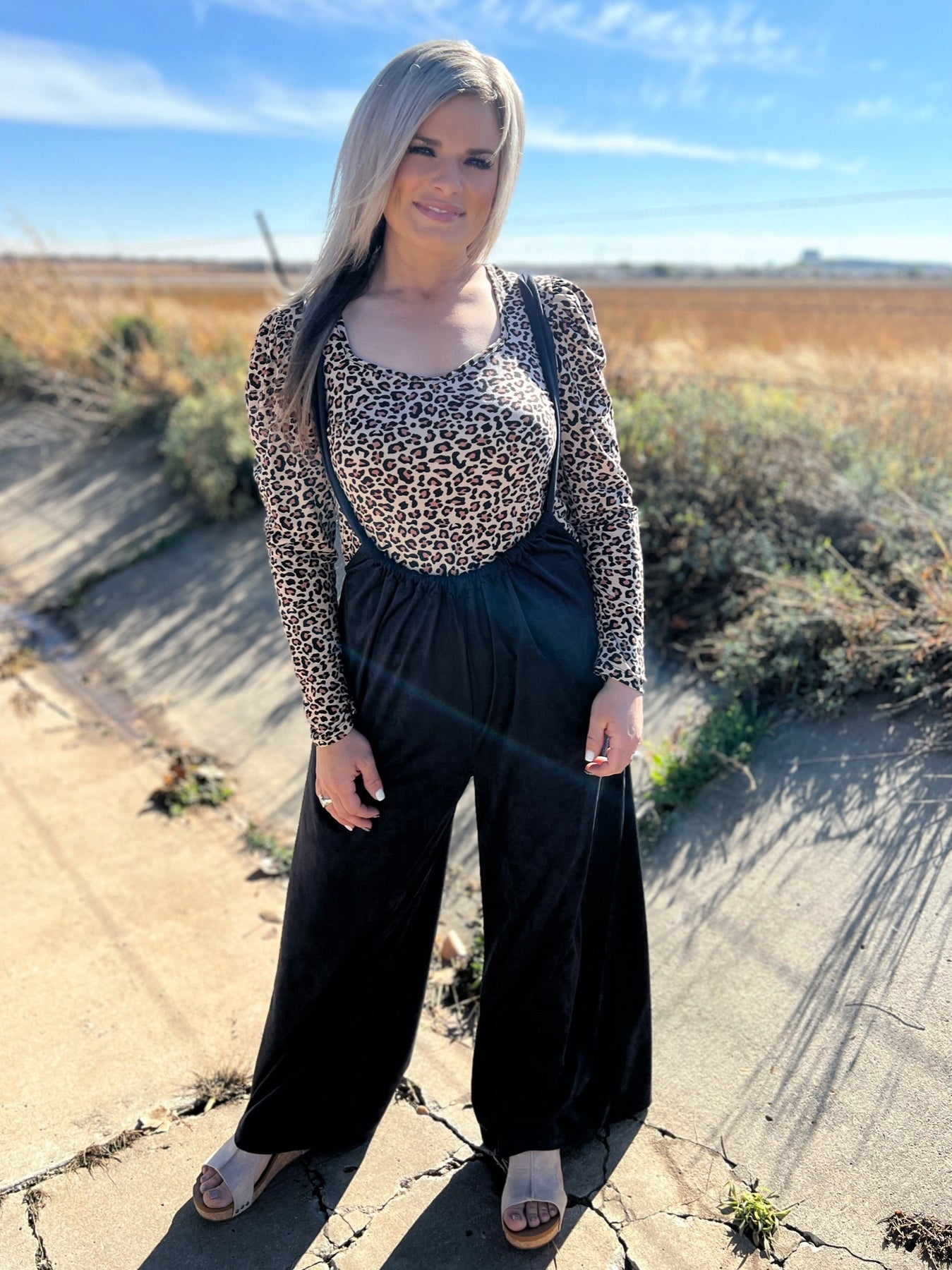 Are you looking for an outfit that's chic, versatile, and comfortable? Look no further than Black Velvet Cover-Somes. These black velvet low cut overalls feature a tie in the back and wide leg pants for maximum styling potential. Feel free to customize your perfect look - the possibilities are endless!