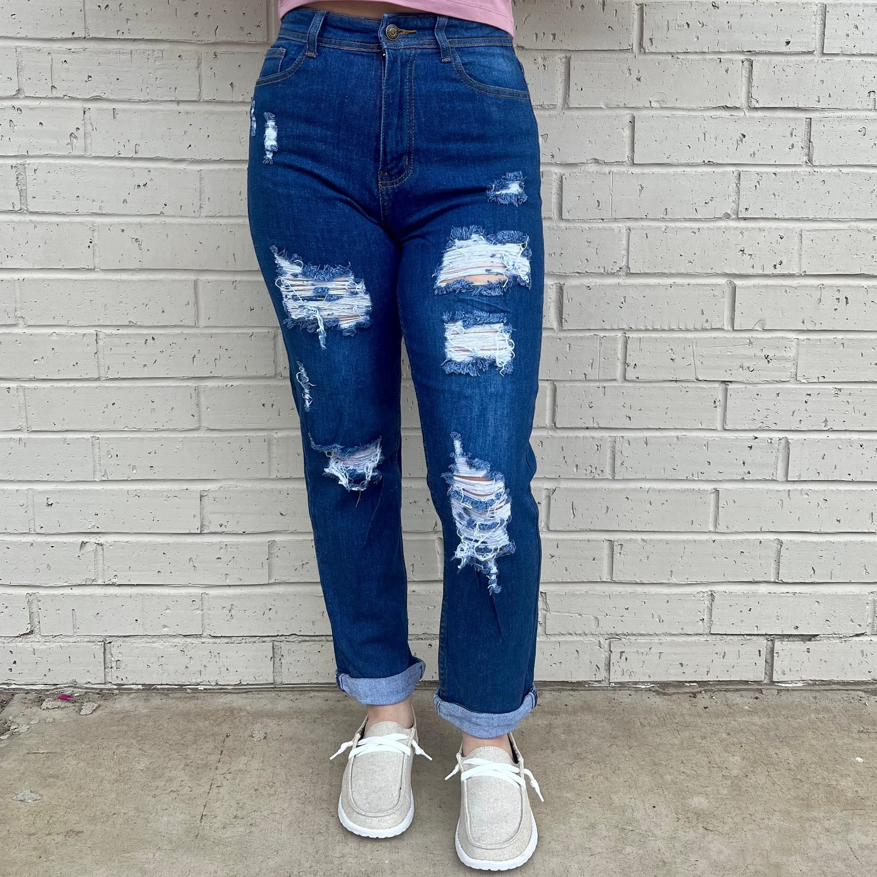 Make a statement in our Everyday Everywhere Denim! These high-waisted mom jeans elevate your look with shredded kneeholes, a distressed hem, and 5 pocket styling. Plus an unbeatable blend of 92% cotton, 6% polyester, and 2% spandex for the perfect fit and comfort you can wear for any occasion!