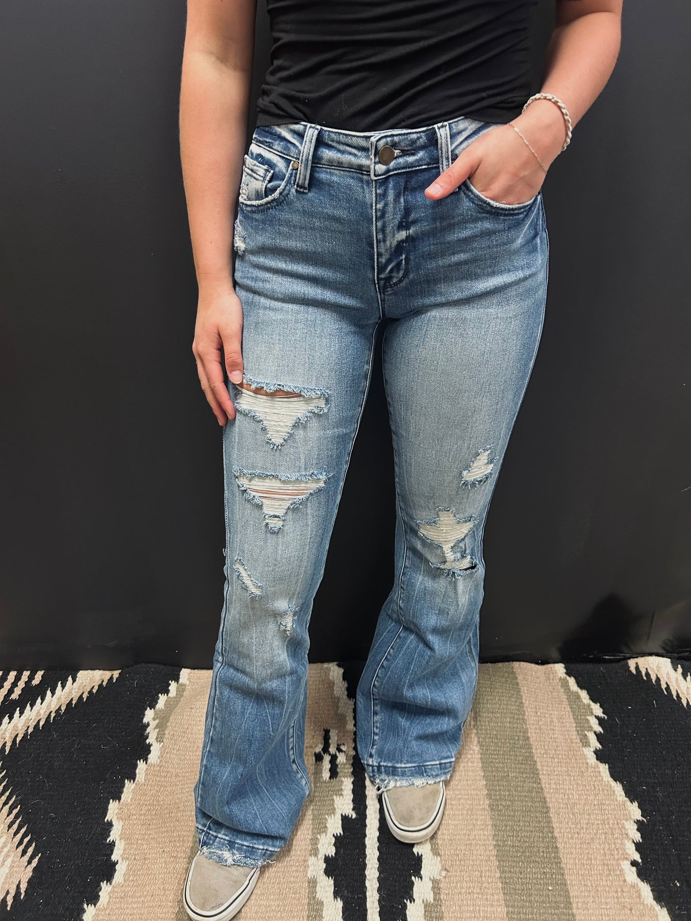 Introducing The 806 Trouser Flare - the stretchy, distressed mid-rise dream you didn't know you needed! With a 9" rise and 34" inseam, you're sure to look ultra-fly, and it boasts a trouser-style hem for maximum legroom. Plus, it's outfitted with all the bells and whistles you need, including a button closure & zip fly, plus five pocket styling for all the stuff you stash. Get your groove on!