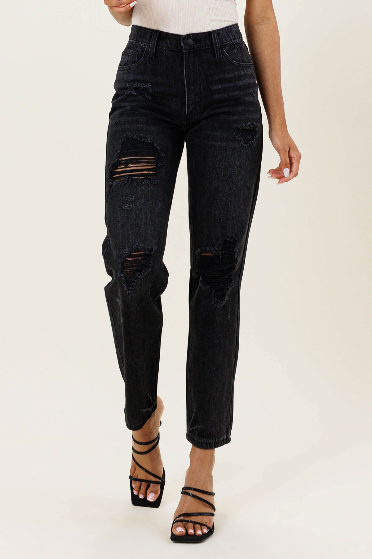 choice for relaxed, casual days! Featuring black distressed denim