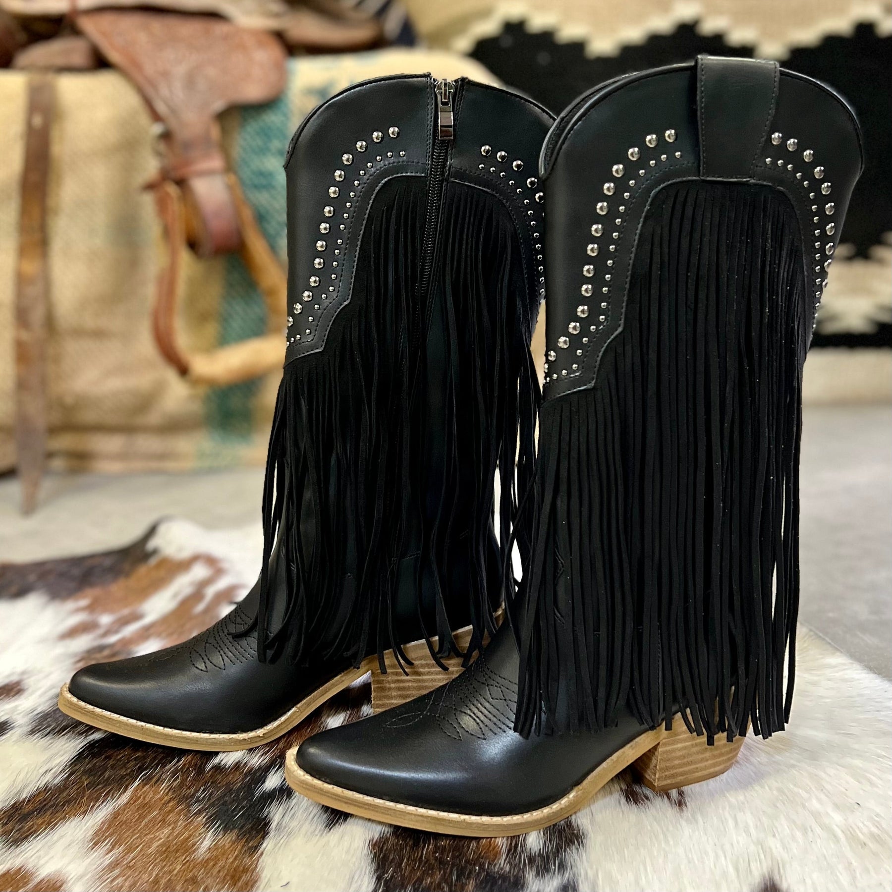 These Beastly Fringe Boots are casual fringe western boots. The come in Grey, Blue, & Black.  These boots are 14 1/2" from heel to boot tops. Featuring 11" fringe down the front and sides with small nail stud detail. They are pointed toe and have a 2 1/2" heel. Inside zipper closure