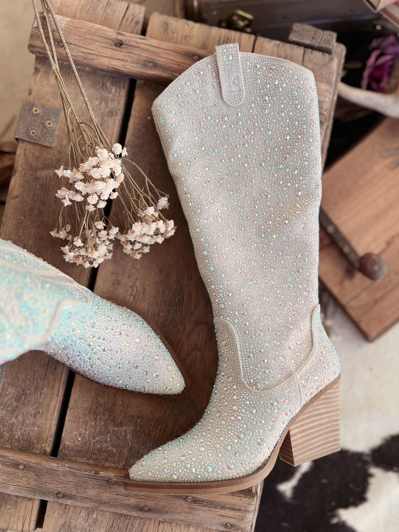Add Glamour to any party with these Tall In a Silver Cadillac Boots with all over iridescent rhinestone detailing. These boots have a Pointed Toe Silhouette,  side  inside ankle zipper closure, 3" wooden block heel, 15" knee length from ankle to top of boot.  18" total inches tall from sole to top of Bootie.