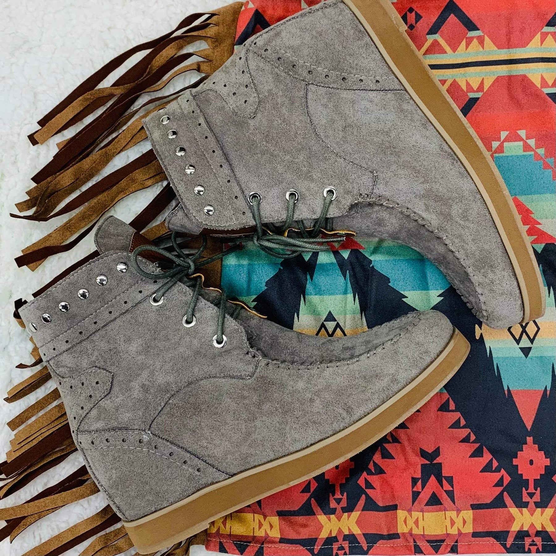 This dove grey suede bootie features a hidden wedge heel and stud details with lace up front. Brown detailing on tongue.