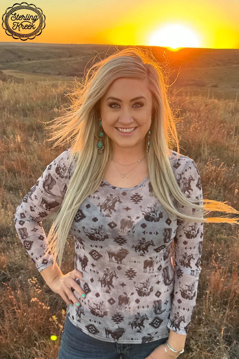 Show off your southwestern style in the PLUS Bison Kreek Top! This gray mesh tank features bison, cowboys on horses, cowboy boots, and Aztec designs, making it the perfect statement piece for your wardrobe. Yeehaw!