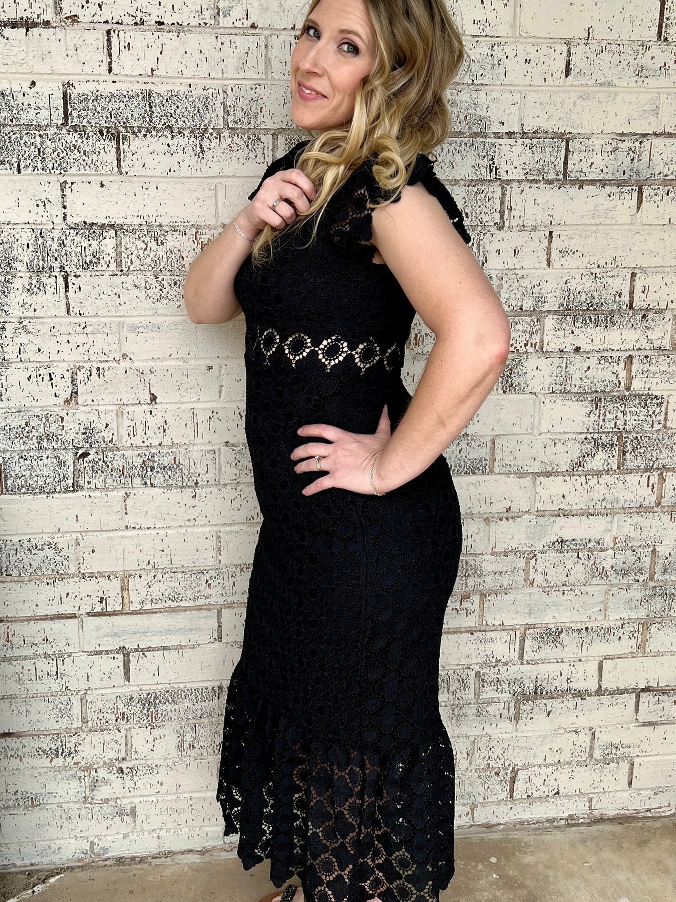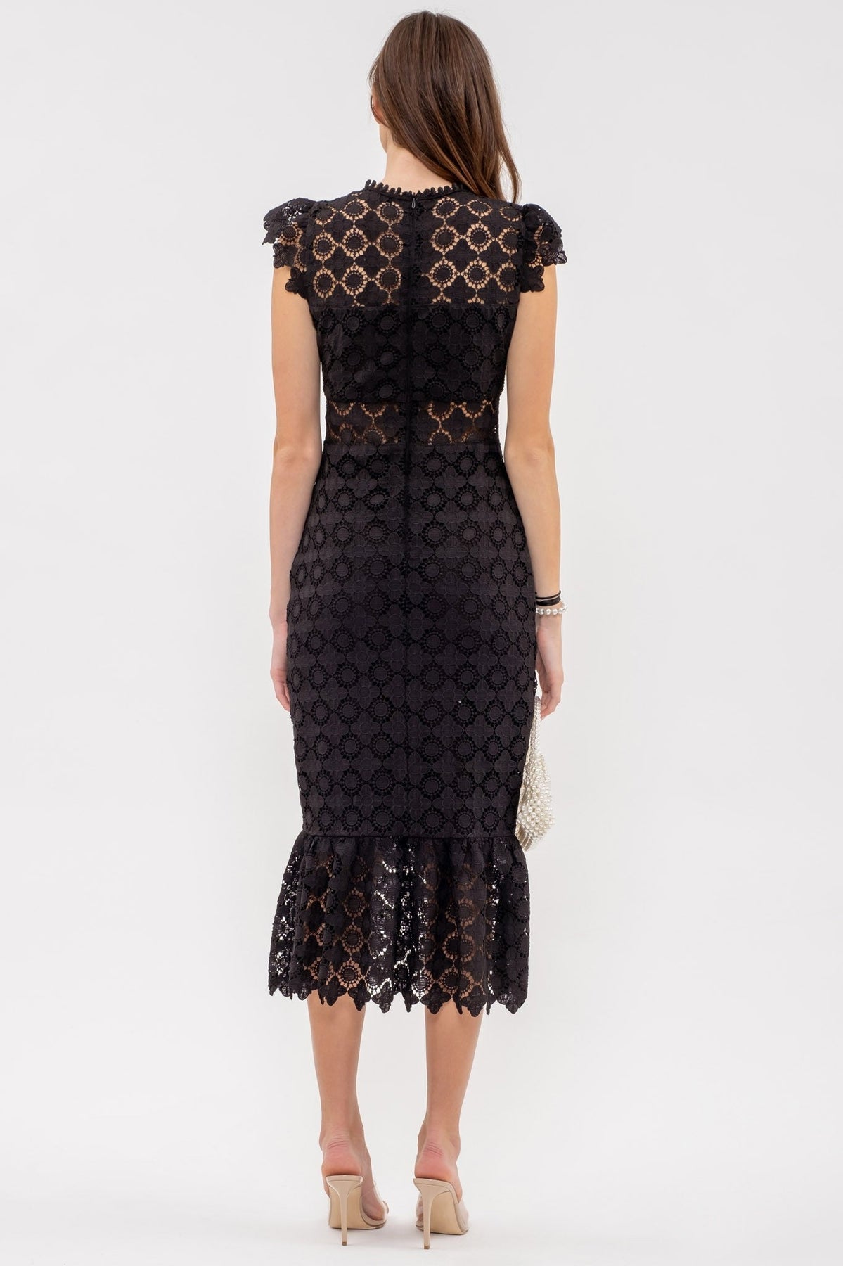 Introducing our Lace Eyelet Dress, crafted with sheer neckline and elegant scallop collar. The sweetheart neckline and ruffle shoulder add a touch of sophistication, while the sheer waist detail and eyelet lace pattern create an exclusive and refined look. Complete with a back zipper closure and ruffle hem, this stunning midi dress is perfect for any special occasion. Made with 100% polyester, excluding decoration, and lined with 100% polyester for maximum comfort. Elevate your wardrobe with this luxurious dress.