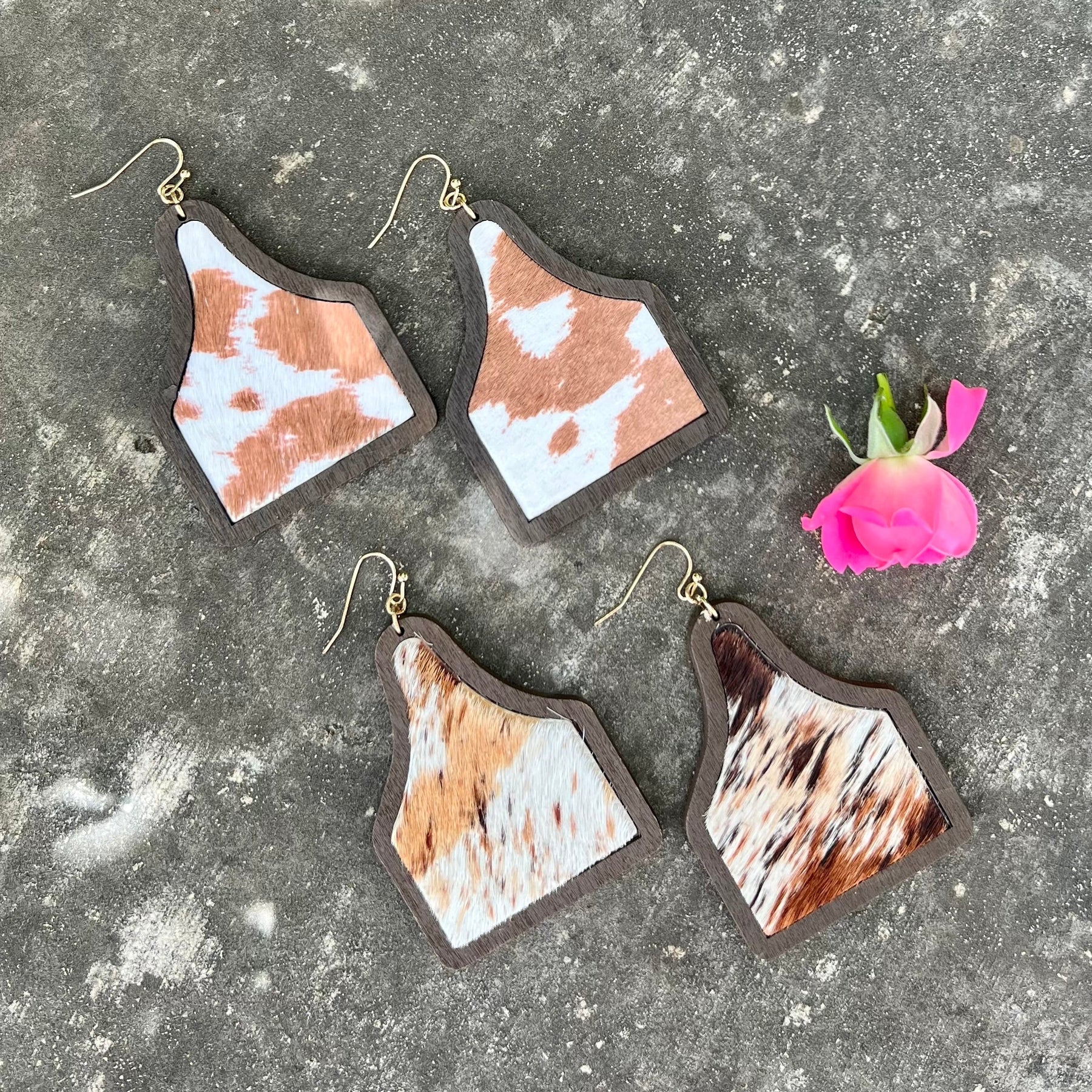 Crafted from smooth brown leather and featuring luxurious faux cow print hair on hide, these dazzling Cattle Co. Earrings make a statement of sophisticated elegance. Choose from two color combinations – brown and white or tri color – each measuring 2.5" in length and finished with a dangling style. Flaunt these timeless accessories with any look for a touch of timeless, luxurious style.