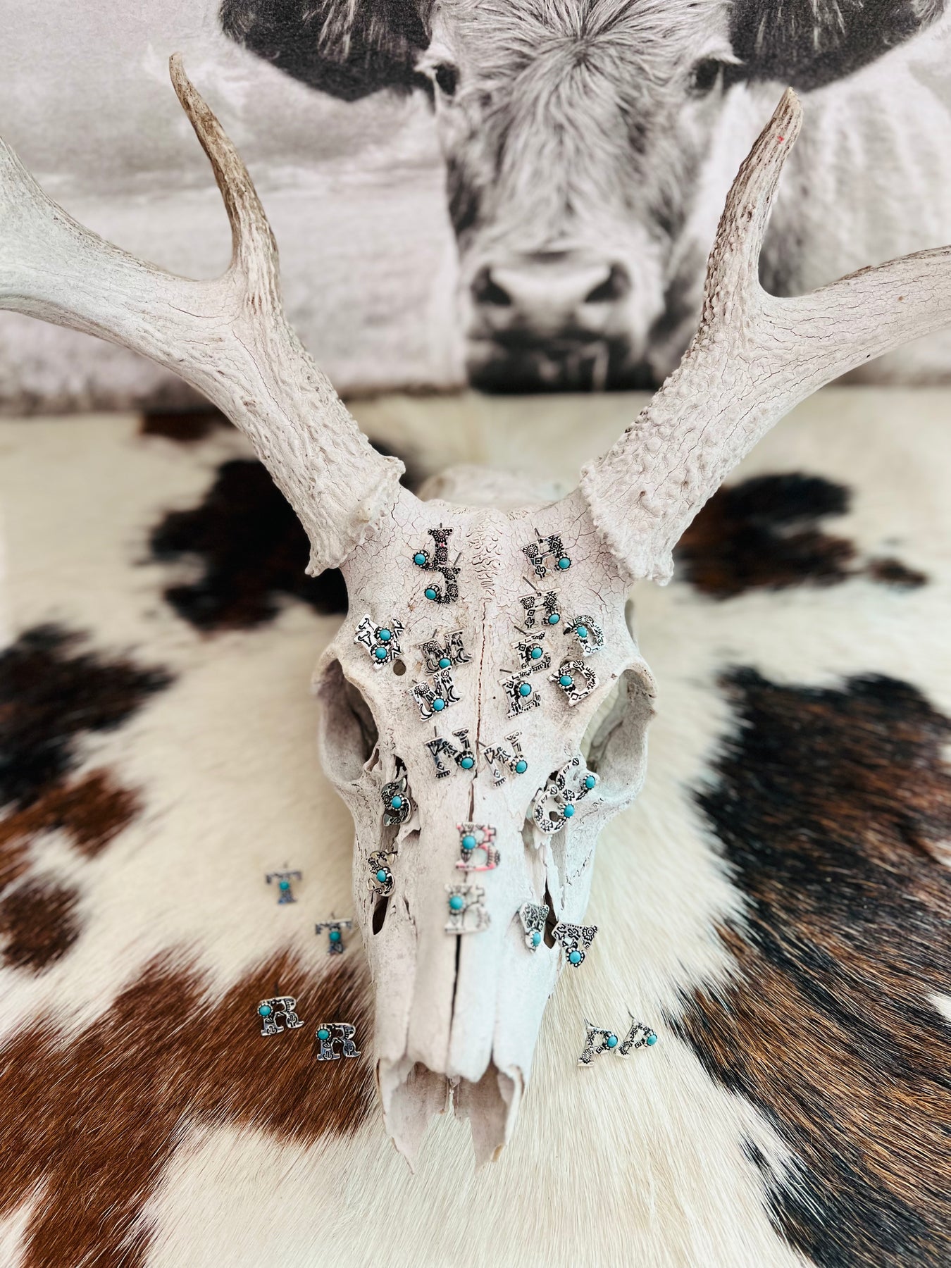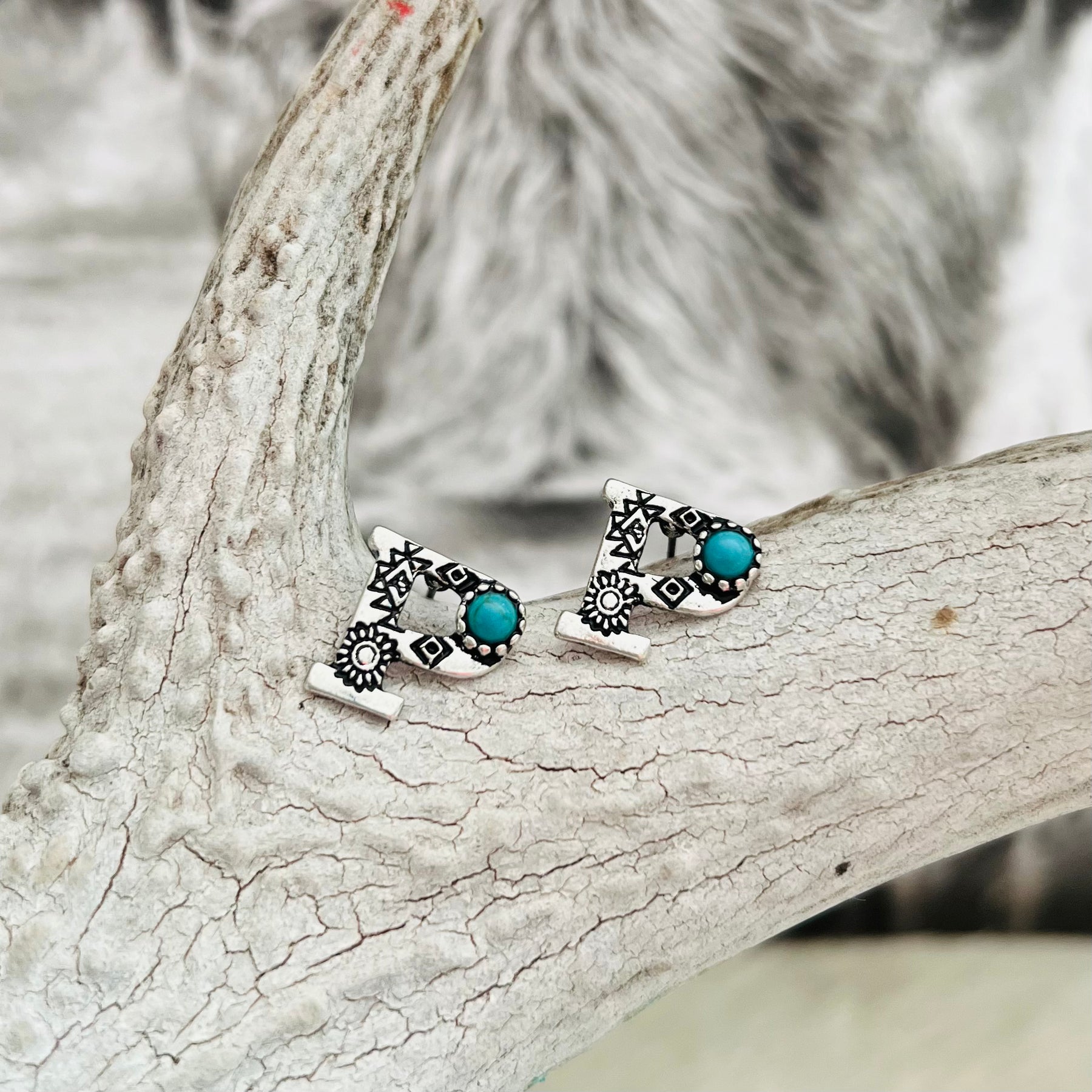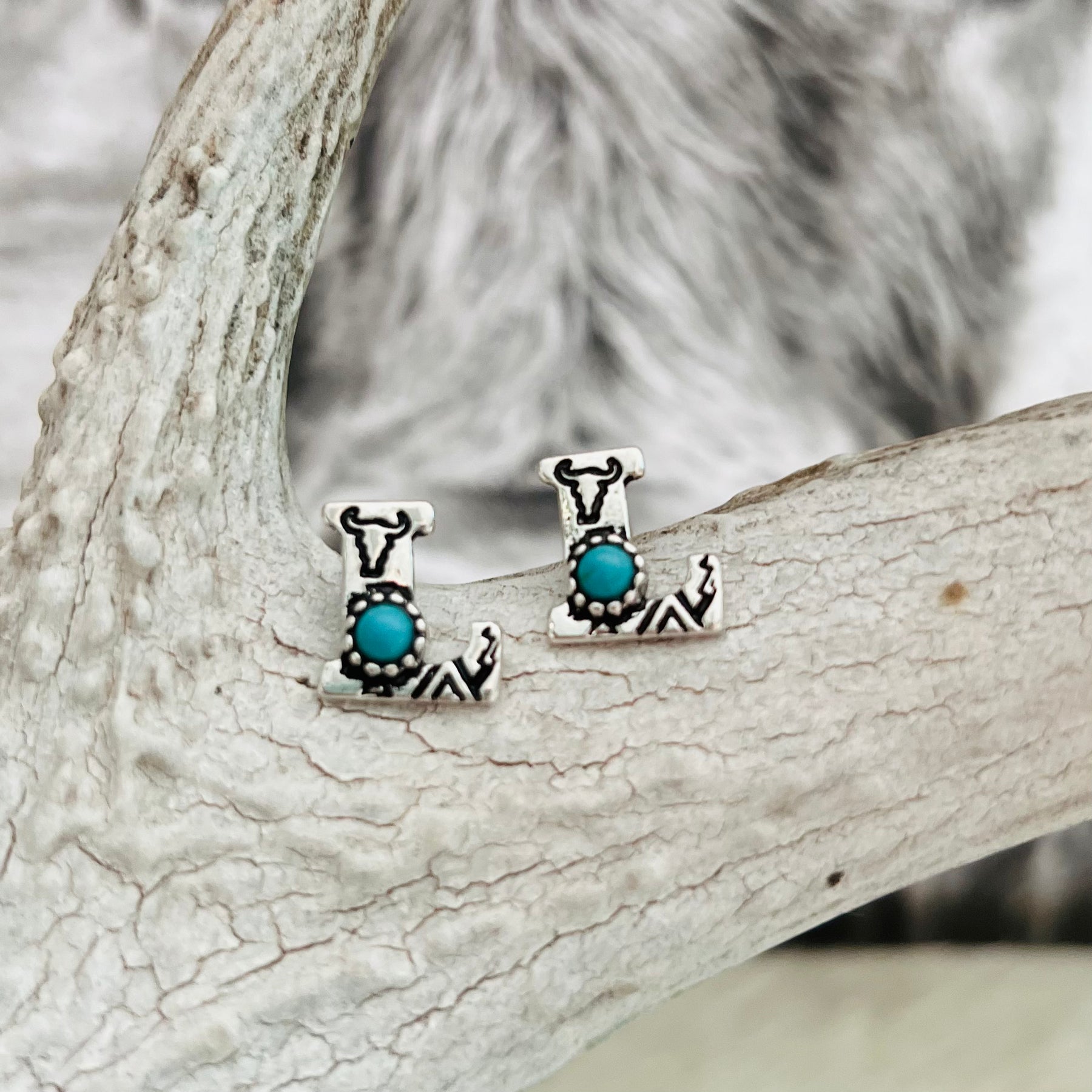 Personalize your look with letter earrings! One of the latest western fashion trends. These high polished western style with aztec and flower textured monogram alphabet pendants are literally made for YOU! The turquoise colored stone on each one is the finishing touch!