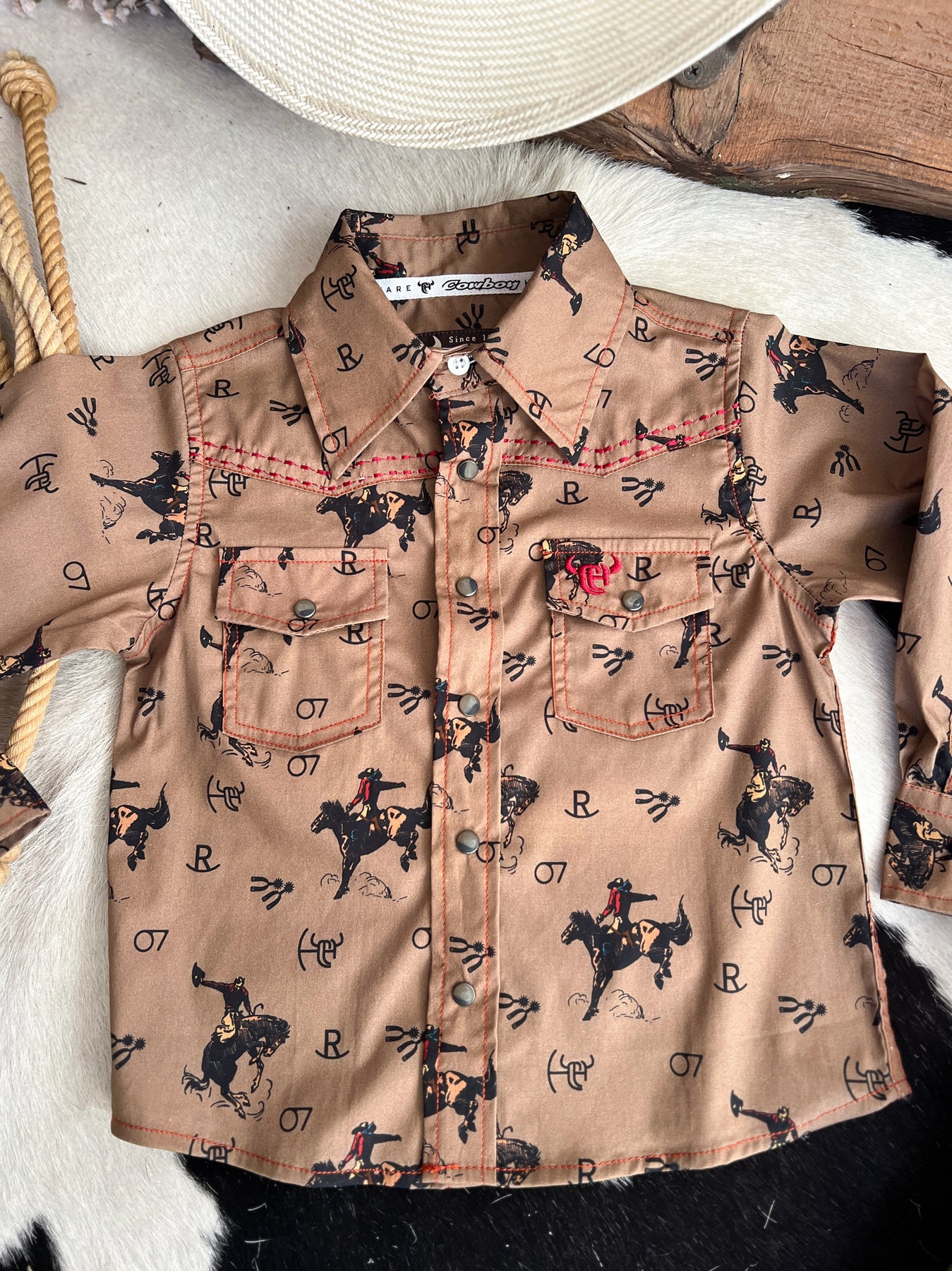 Get your little one ready to ride with our Kid's Vintage Bronc Brown Long Sleeve! This long sleeve button-up features a vintage western bronc and rider design, with  snap buttons for an authentic rodeo cowboy style. Perfect for any little cowboy or cowgirl, get yours now!