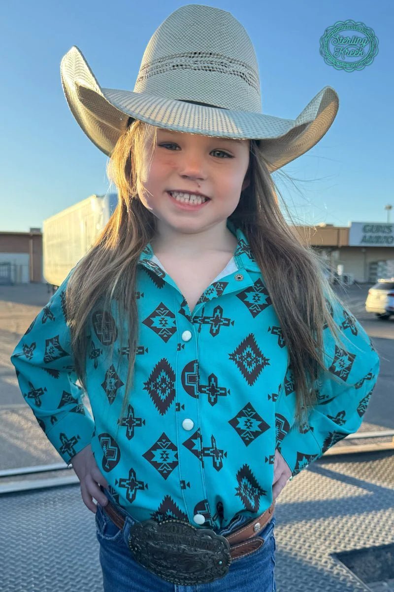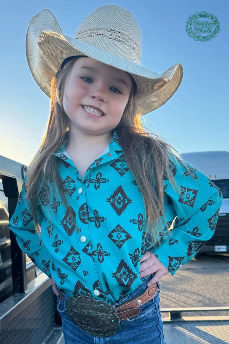 Keep your style top notch with the Mini San Jose Top! This fashionable button-up boasts a turquoise hue and chic brown Aztec designs, making it the perfect pick for any fashionista. Add a touch of unexpected flair to your wardrobe with this hot mini!