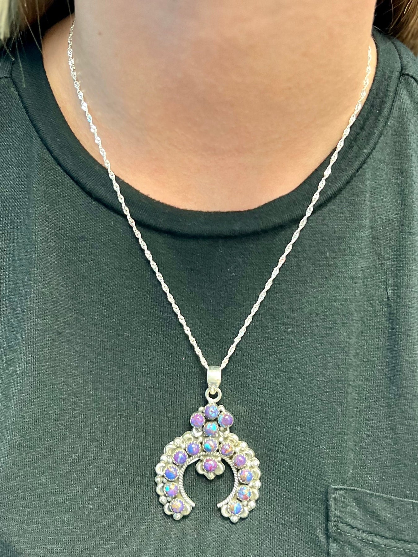 This unique piece of jewelry from the SS Purple Mojave Collection is a timeless piece crafted with luxurious details - made with sterling silver and a handcrafted Purple Mojave  Squash Blossom pendant, this pendant is sure to exude sophistication and exclusivity. Perfect for any special occasion, this pendant is handmade by Navajo artisans from Gallup, New Mexico.