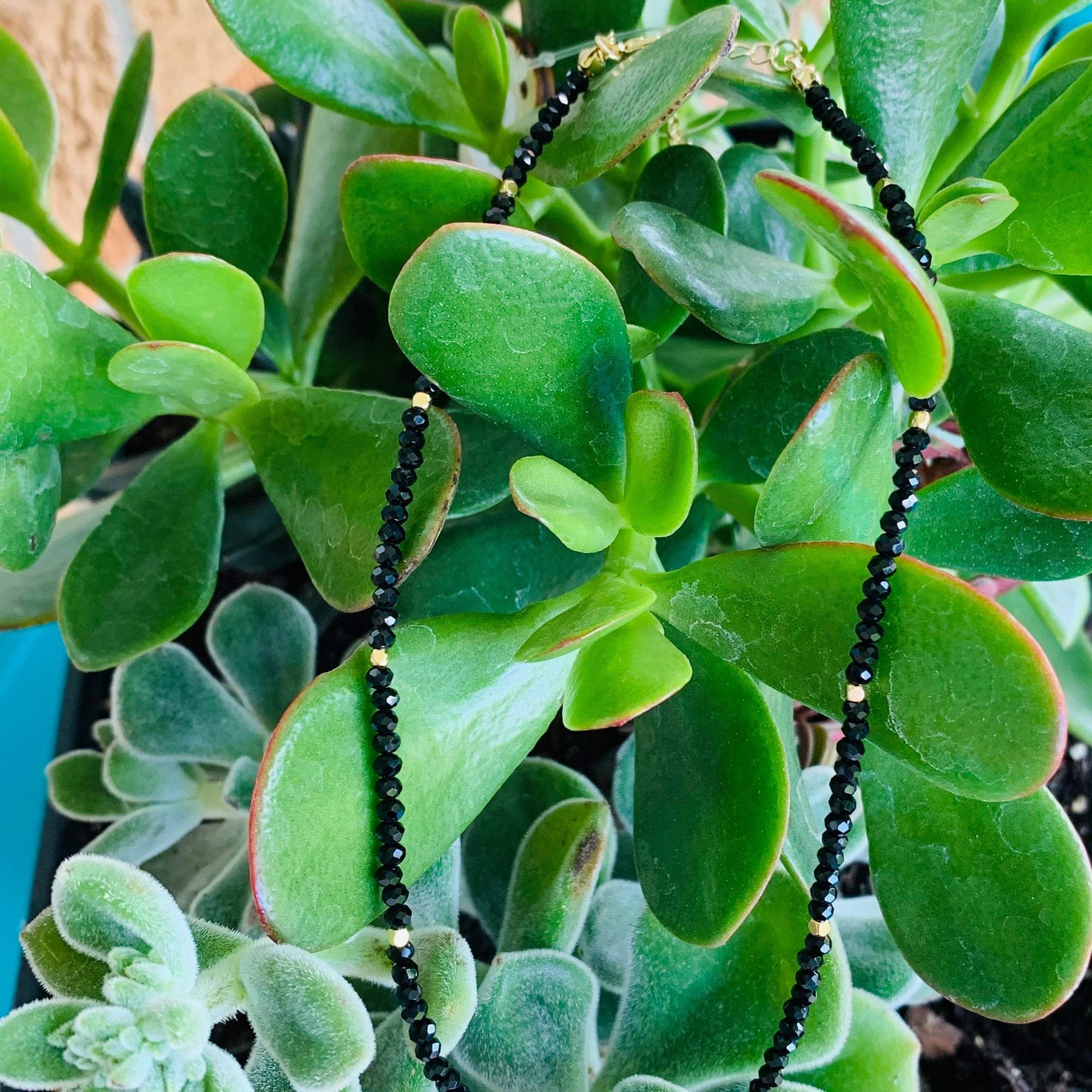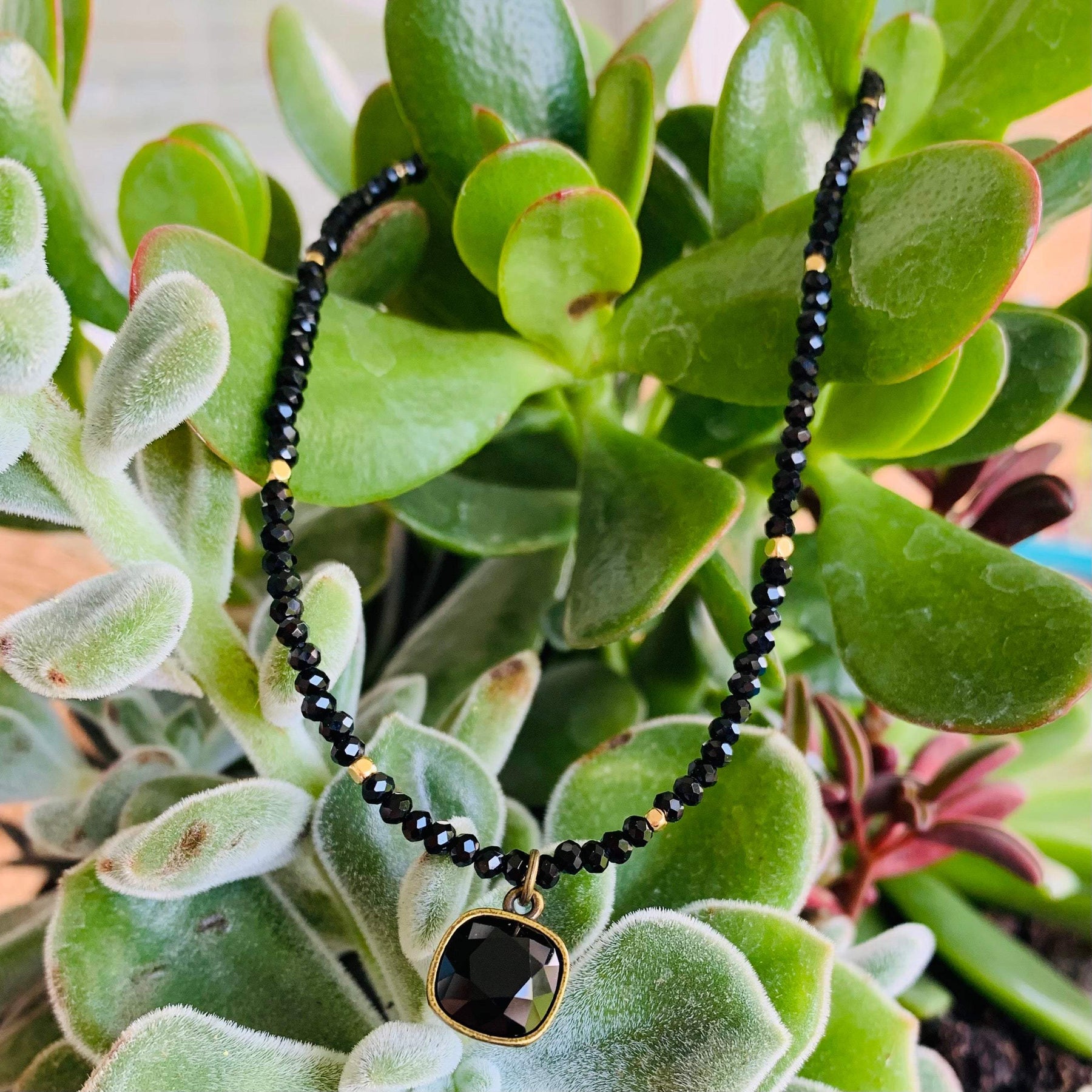 Black seed beads accented with gold and a cushion cut black crystal pendant.