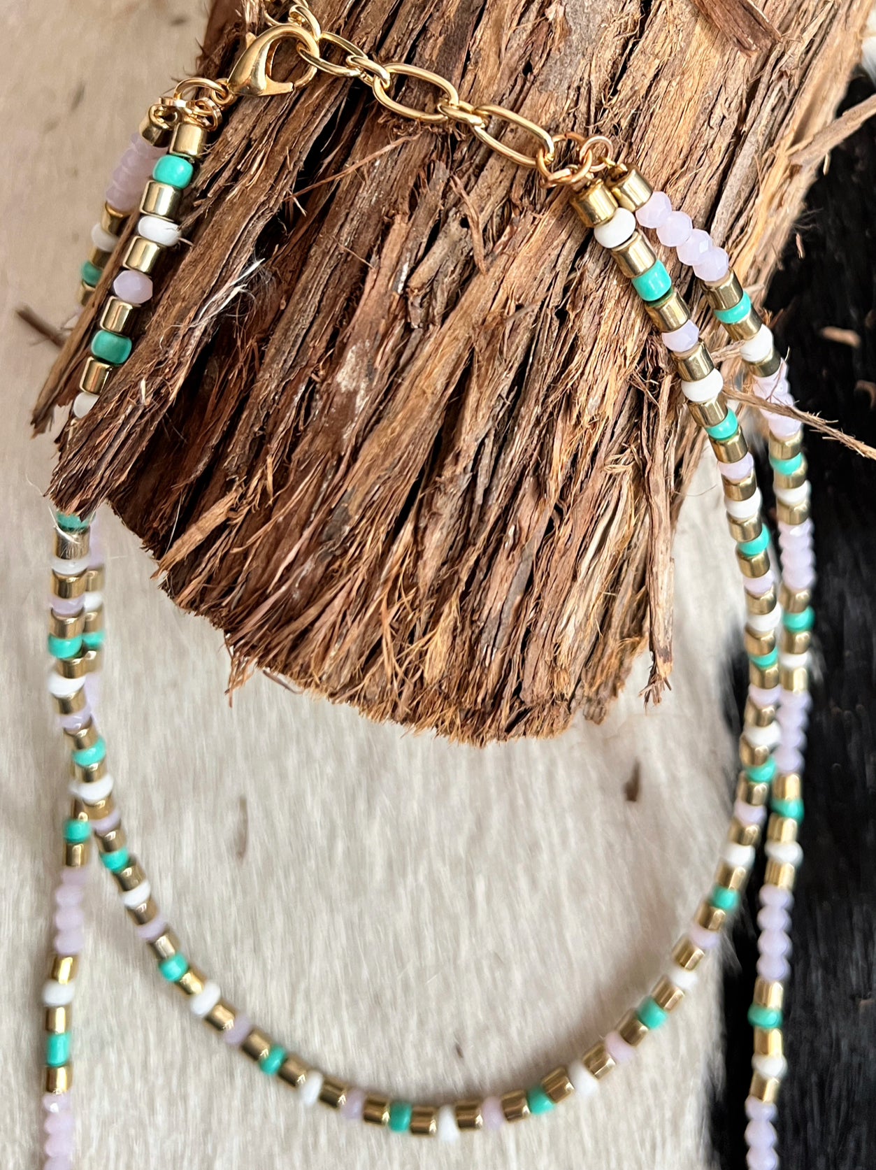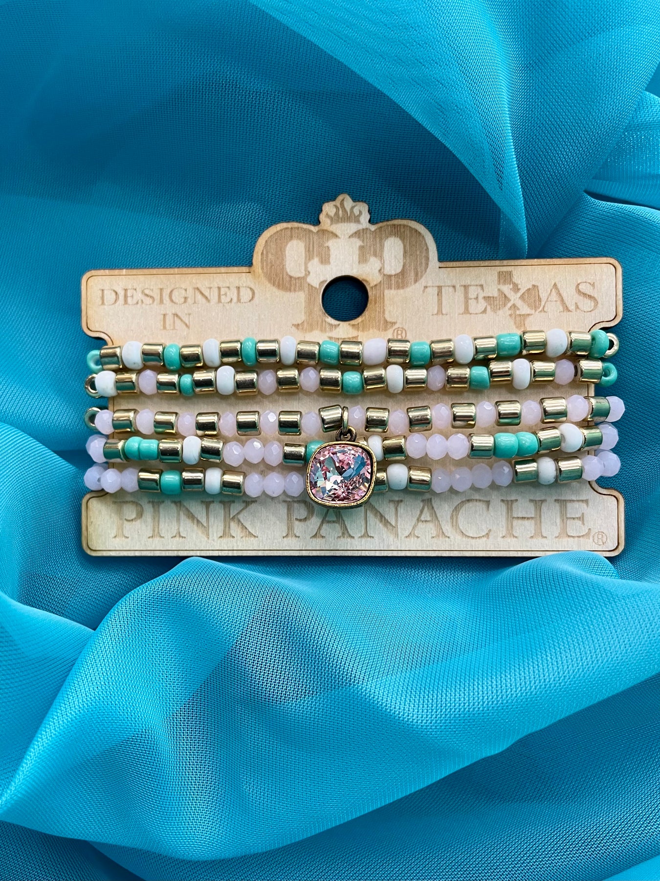 Rule over any outfit with the Panache Pink Princess Necklace. Made with gold, light pink, and light green beads, this double stranded beauty comes in 12" and 18" strands. With a Dainty pink 1/2" pink dangle stone. Simply stunning!