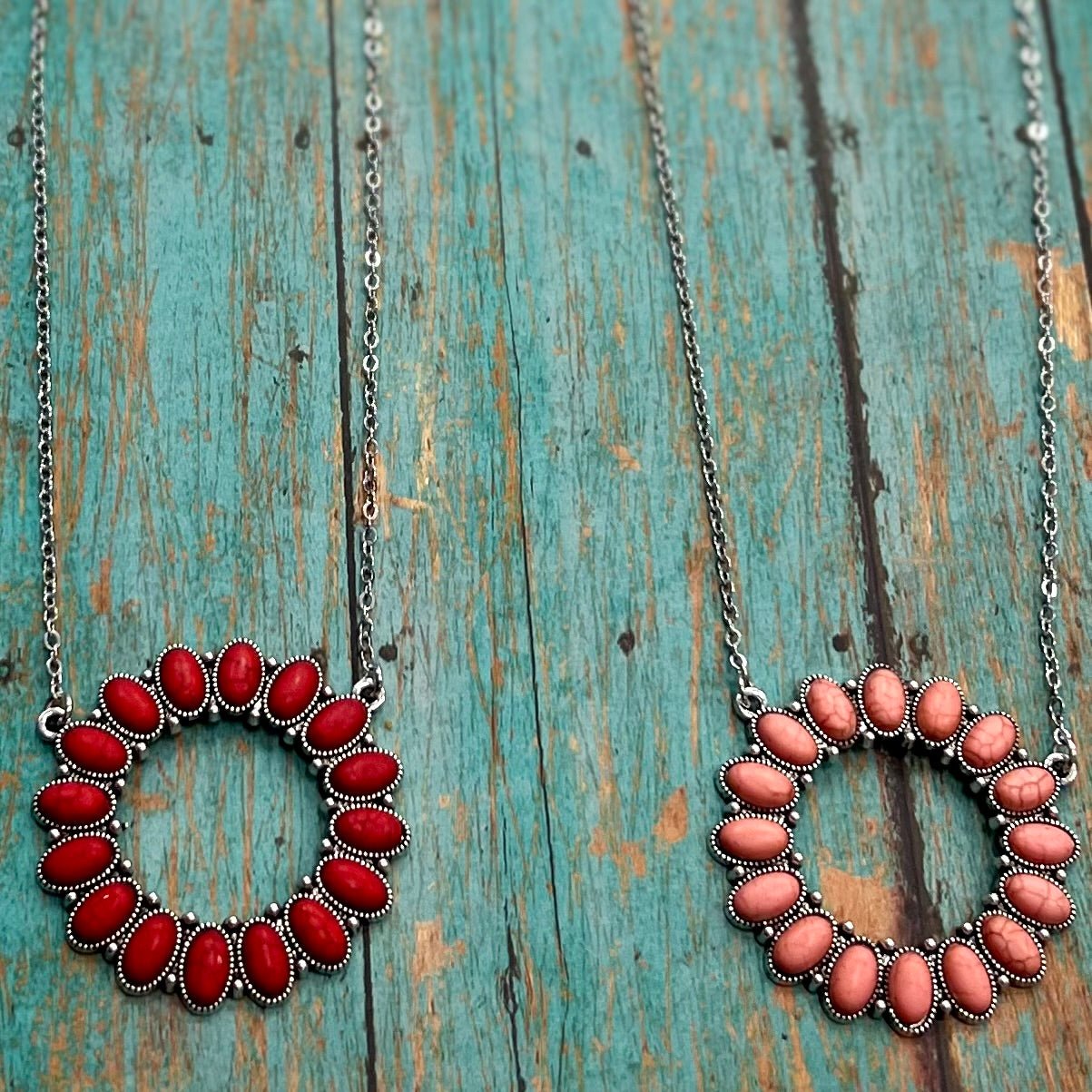 Step into the wild west with our Ring of Fire Necklaces! This stylish open pendant necklace features a unique 'ring of fire' composed of natural stone in beautiful shades of red and pink. With one of these showstoppers hangin' off your neck, you'll be ropin' in compliments left and right! So gallop on down and saddle up with this sizzlin' western look!