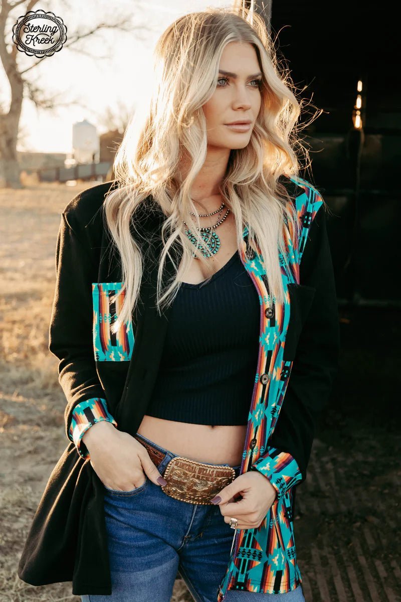 Our ONE AND ONLY SHACKET is the only one you'll ever need! This stylish shacket is like two clothes in one - its black on one side, and features a wild western aztec print on the other. With our shacket, you can jump right into the wild west without ever leaving your house! Yee-haw and yippee-ki-yay!