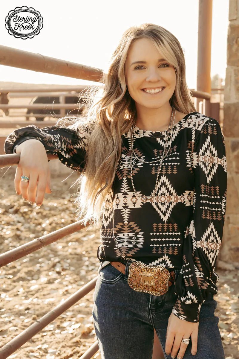 Make a fashion statement with this breathtakingly beautiful PLUS ANDES KNIT TOP! Featuring a gorgeous black canvas with pops of brown and tan aztec knit, plus bubble long sleeves, this top is sure to turn heads! Get ready for compliments when you strut your stuff in this show-stopping design.