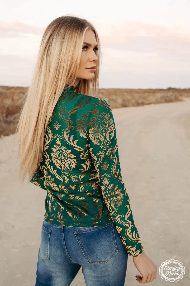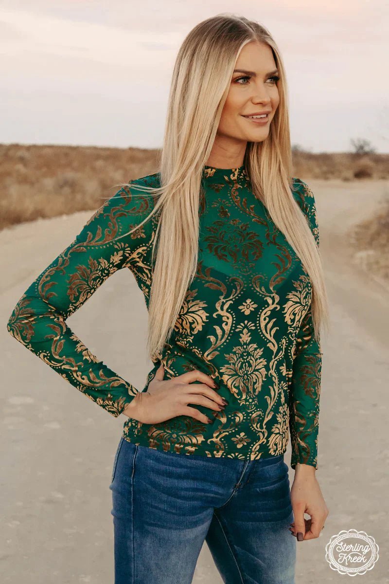 Dazzle them in the Bellagio Fountain Top! This gorgeous green long-sleeve features a high collar with a golden velvet design that's guaranteed to sparkle wherever you go. Perfect for a night on the town, this top is the perfect way to make a statement without saying a word.
