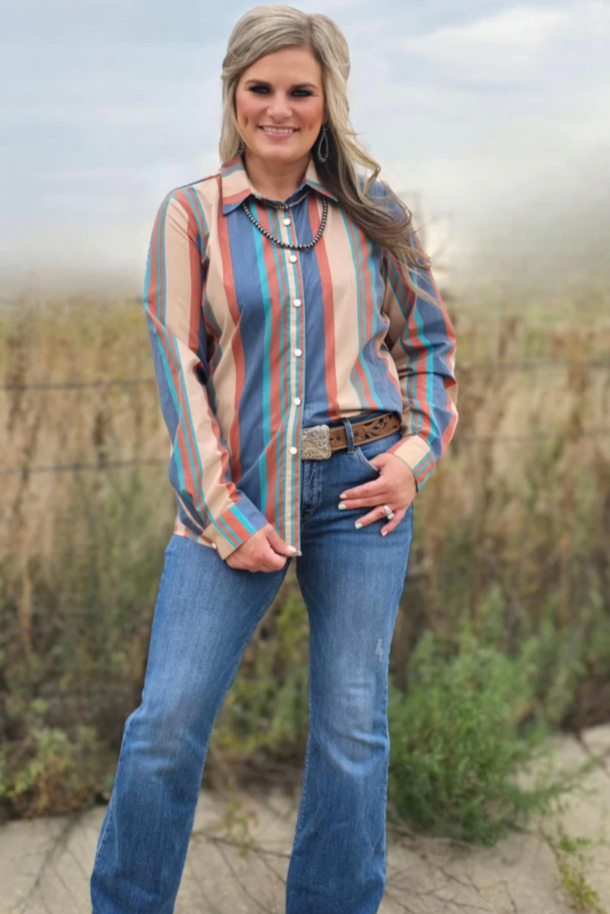 Embrace the cozy spirit of fall with this pearl snap button-up, featuring warm, season-inspired stripes that add subtle color to your wardrobe. Designed for comfort and style, it effortlessly layers over your favorite outfits, making it a versatile choice for crisp autumn days. Elevate your seasonal look with this timeless, easy-to-wear shirt.