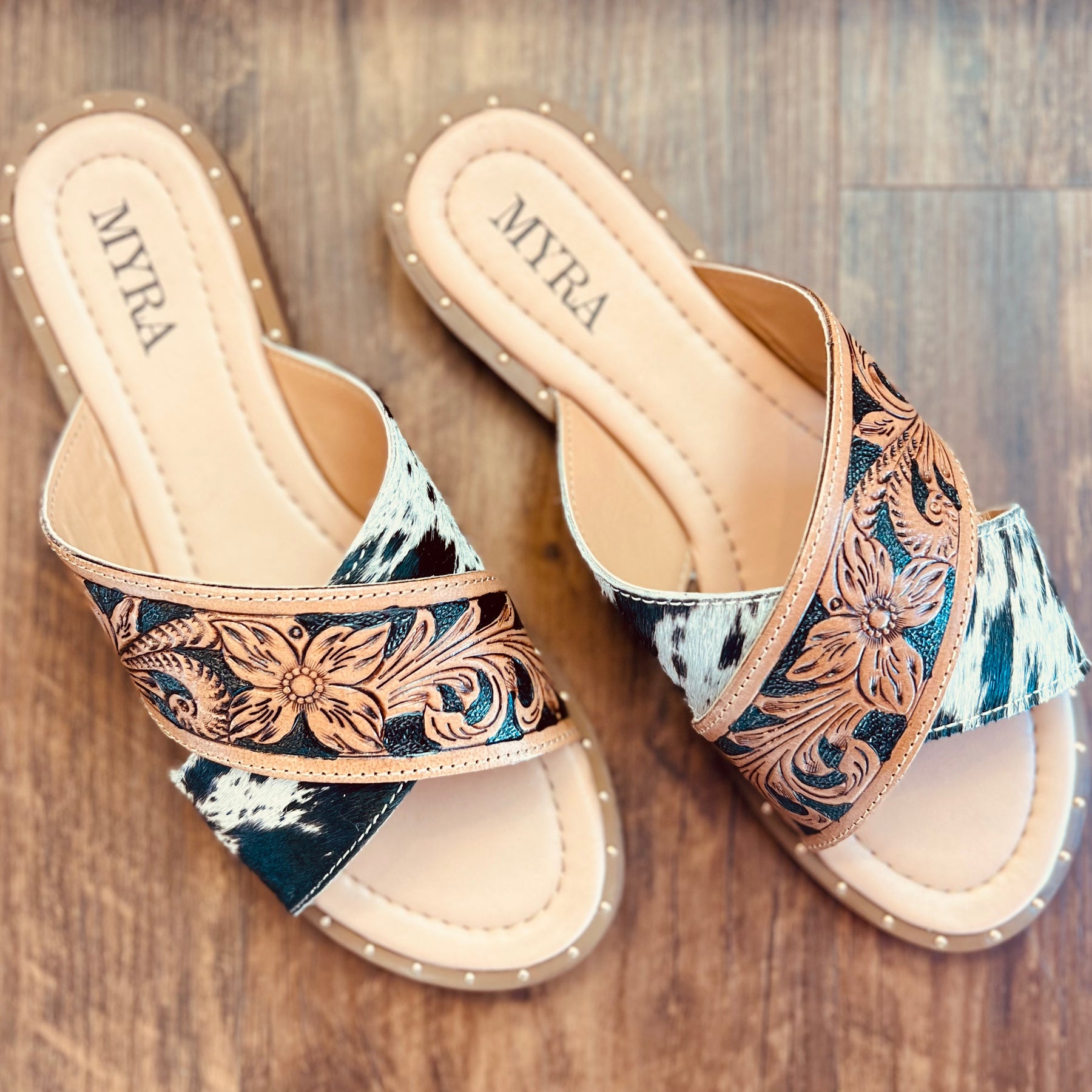 Criss-cross strap slide on sandals in hand tooled leather and black and white hair on hide.