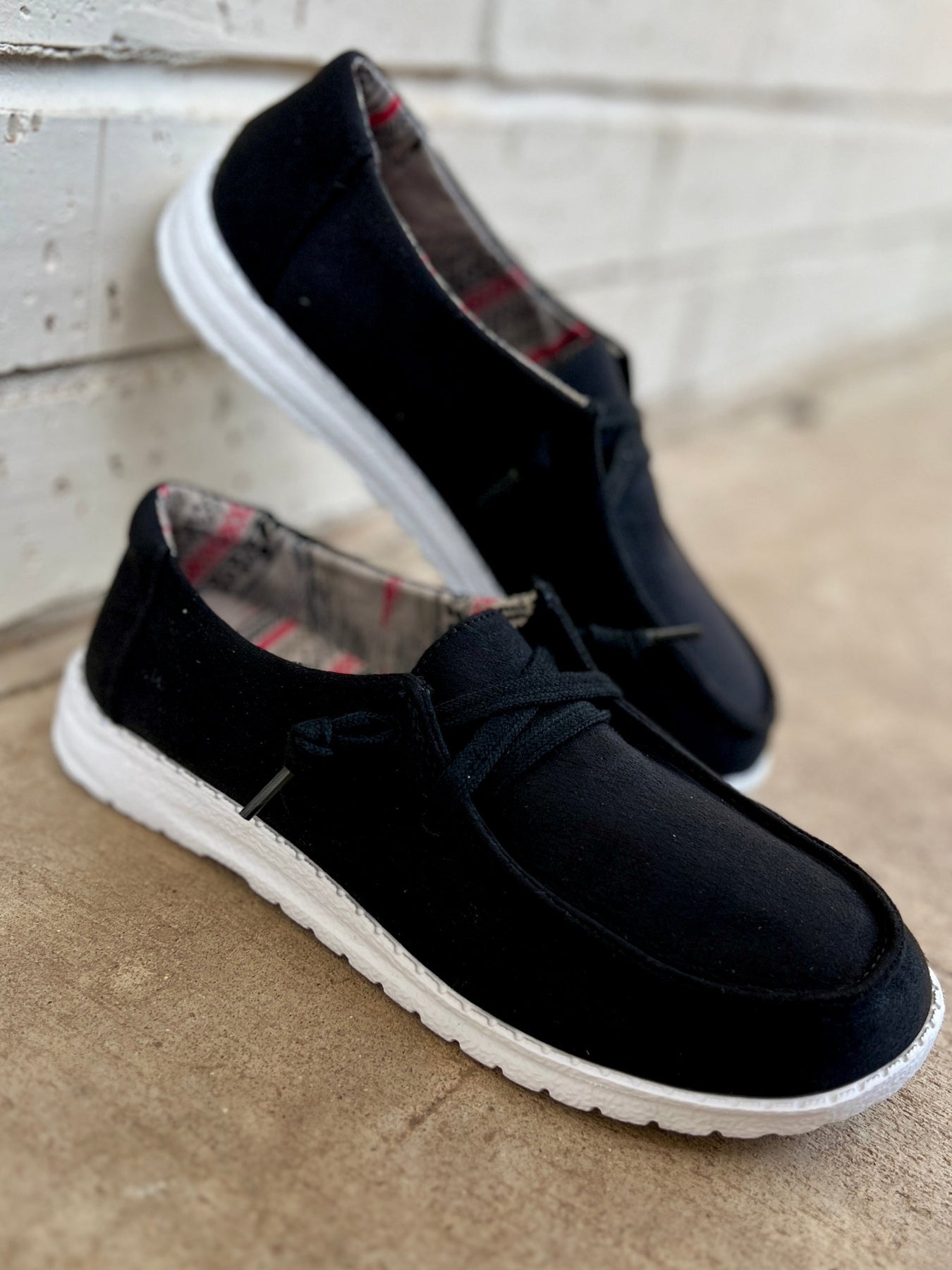 Get ready to kick back and relax in our Midnight Kissed Loafers! Slip into these stylish black shoes for a comfortable and casual look. The suede-like material adds a touch of luxury while the white sole brings a playful contrast. Perfect for any laid-back occasion!