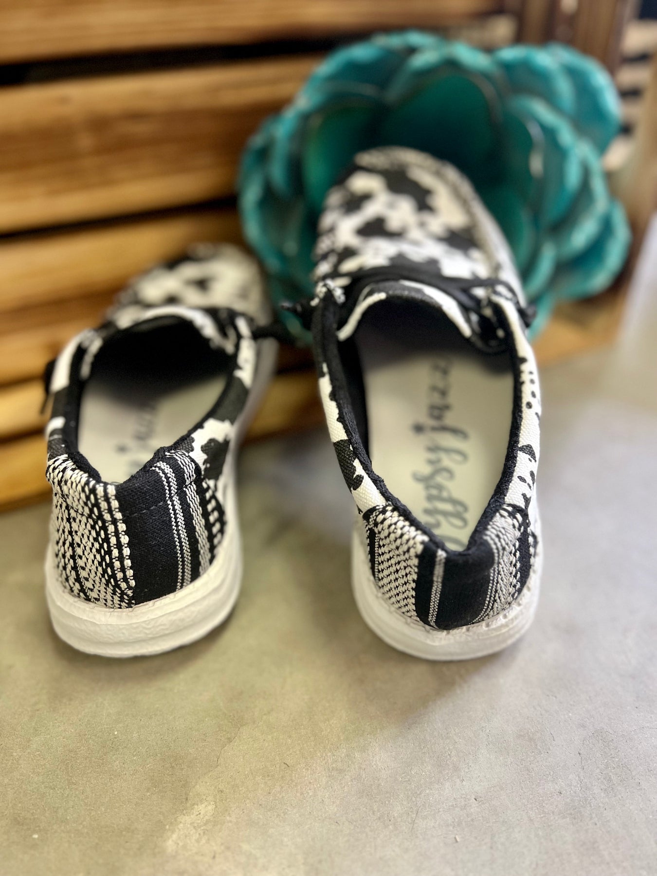 Introducing the Cow in a Meadow Loafers. Gracefully crafted with a black and white cow print for a timeless look, and a black and white aztec print to add a splash of character. Slip on with ease and a comfort sole for a luxurious, relaxing fit. All together, these shoes offer a beautiful and comfortable look for any occasion.