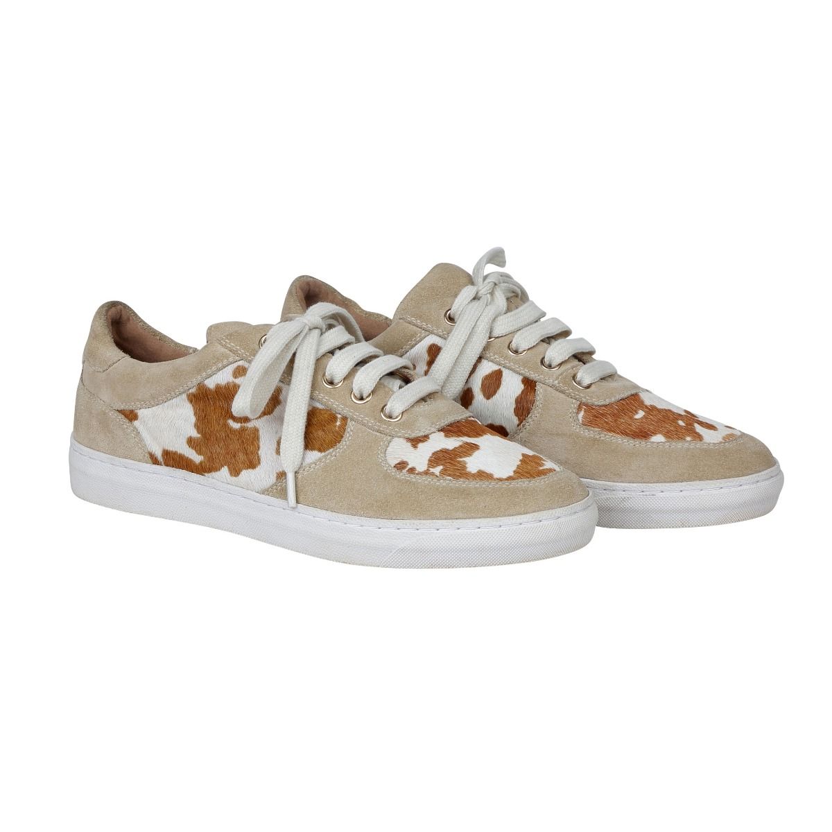 "Walk on the wild side with Daddle Sneakers! These tan suede sneakers feature a playful brown & white cow print made from genuine hair on hide for a unique touch. With white shoe laces and soles, these comfortable sneakers are perfect for adding some quirkiness to your shoe game. A must-have for those who don't take themselves too seriously!"