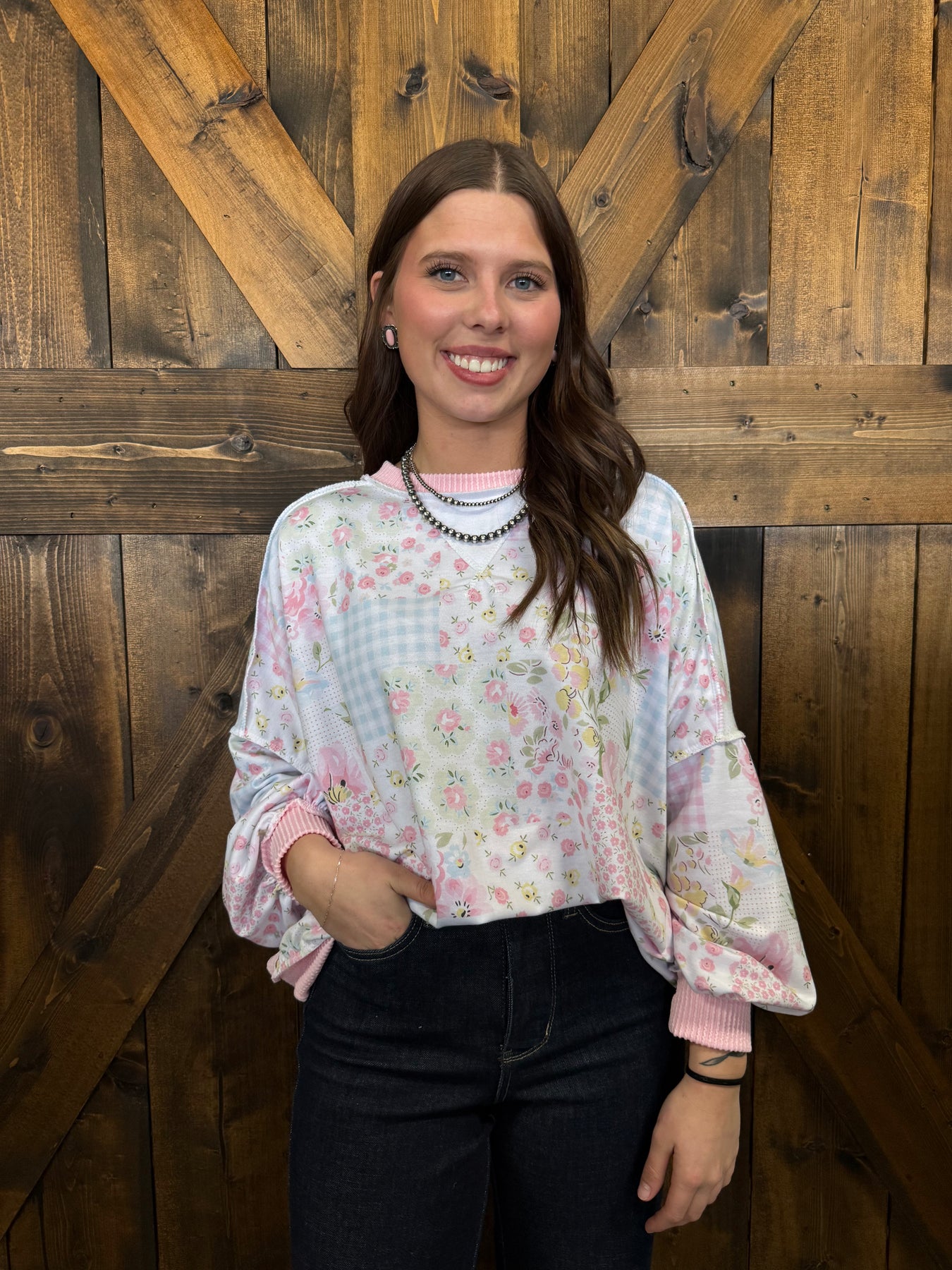 Blush pink and blue denim crew neck top featuring a charming floral pattern throughout. This oversized silhouette showcases drop shoulders and long sleeves for an effortlessly relaxed fit. A distinctive triangle detail adds visual interest to the design. Perfect for layering or wearing solo, this versatile piece transitions seamlessly from casual days to weekend outings. Polyester, Rayon & Spandex material.