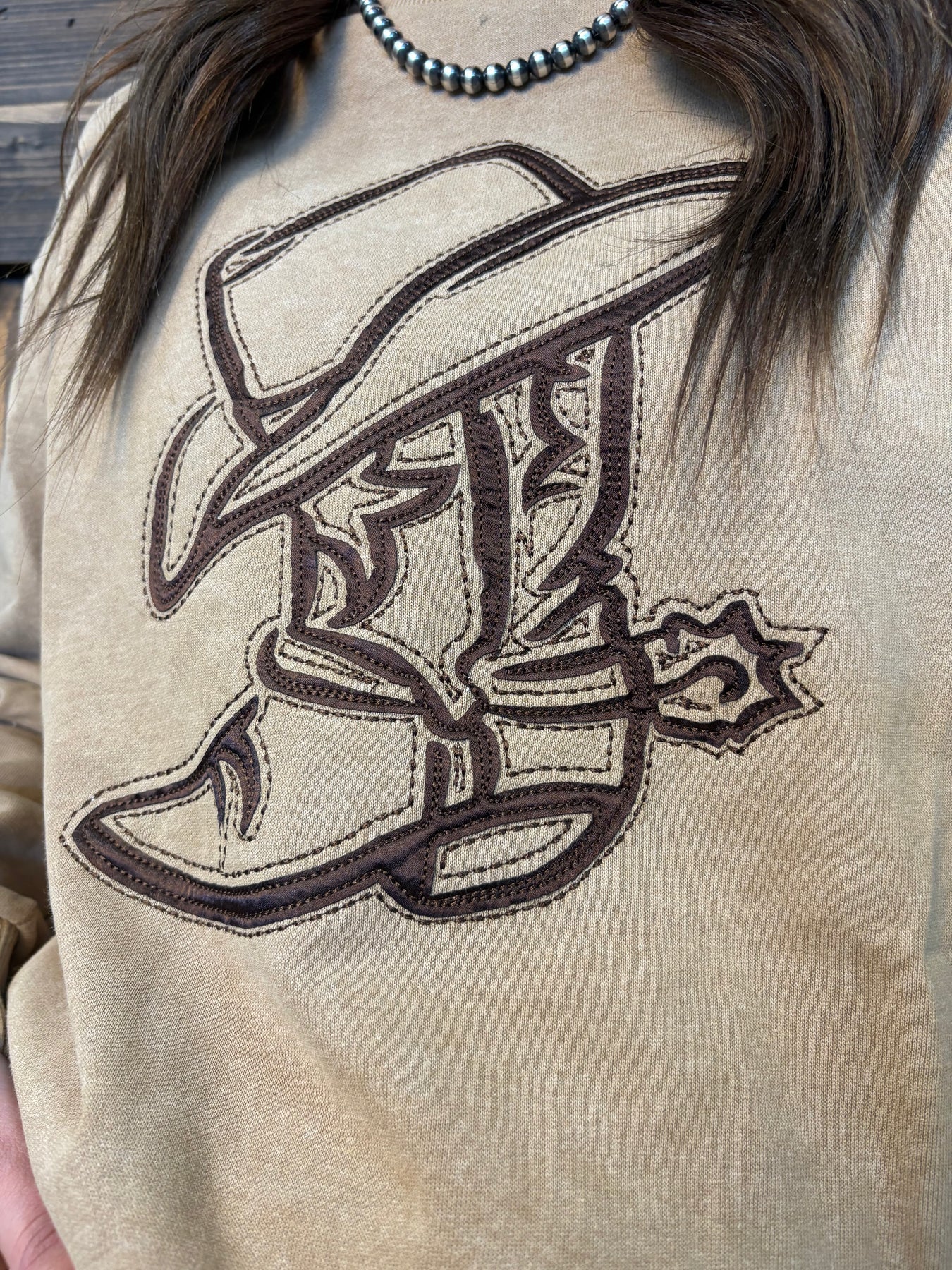 Saddle up in style with this delightful camel sweatshirt that celebrates all things Western. Hand-crafted brown embroidery depicts a charming cowboy hat and spurred boot, bringing vintage flair to your everyday look. Constructed from 100% cotton with long sleeves, it's soft enough for all-day wear and fun enough to make a statement. Whether you're channeling ranch vibes or just love a good nostalgic touch, this piece delivers personality with every wear.
