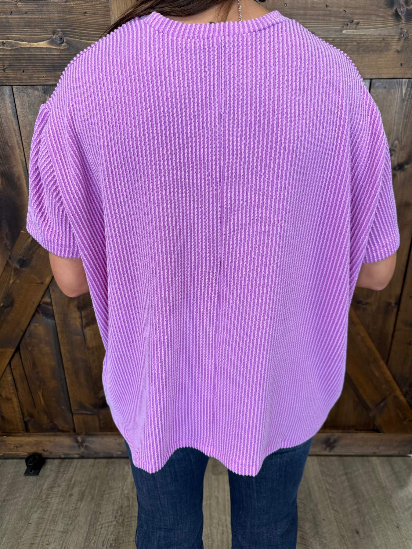 Slip into effortless style with this relaxed-fit top that's got all the right moves. The raised rib texture adds visual interest while the short sleeves keep things breezy and comfortable. A handy front pocket means you've got a spot for your essentials—because pockets are always a win. Crafted from a dreamy polyester, rayon, and spandex blend, it drapes beautifully and moves with you. Choose between soothing Lavender or cheerful Spring Violet to match your mood.