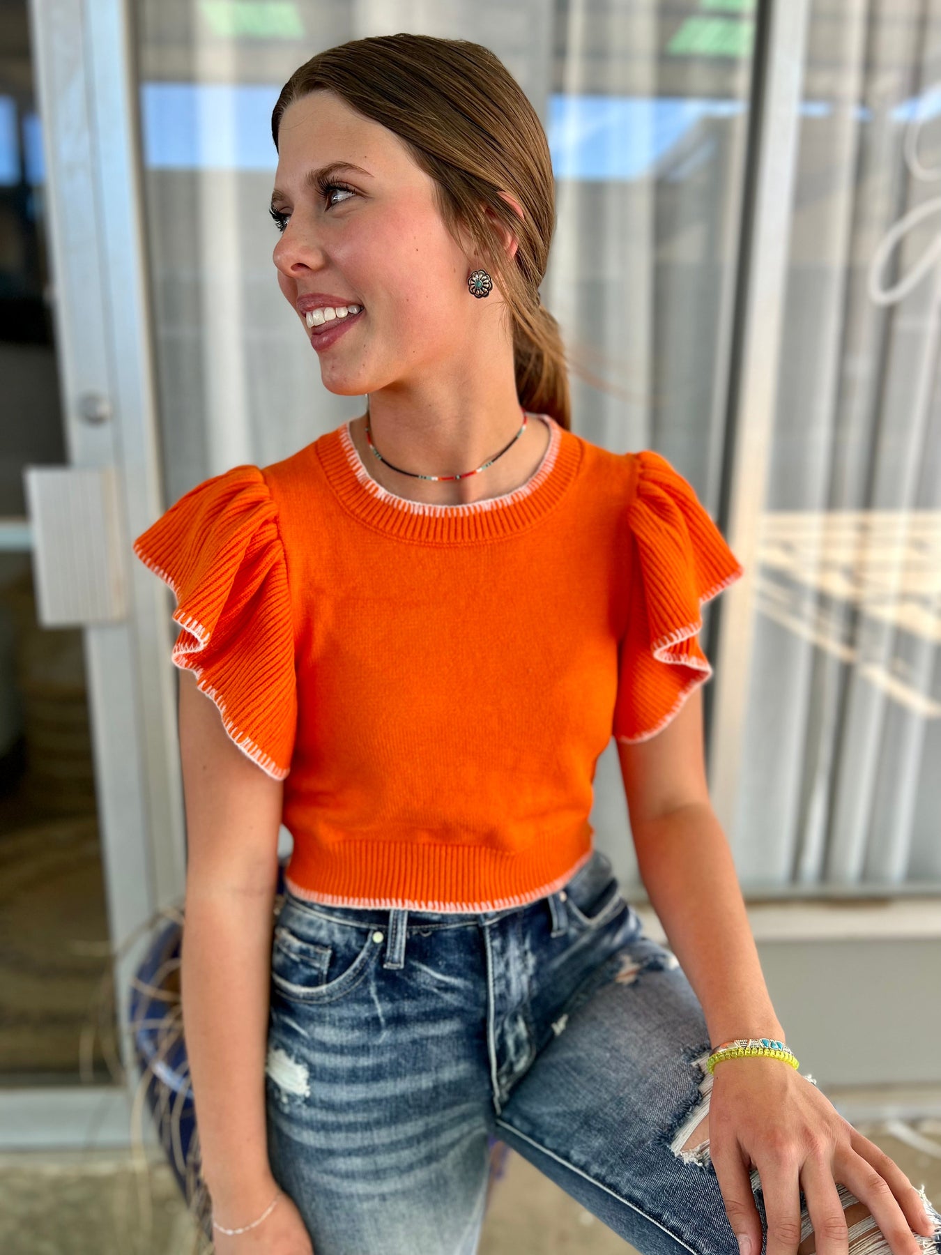 Look no further for the perfect wardrobe staple! This sunkist orange and white cropped sweater is sure to be a hit. With ruffle sleeves and contrast threads, you'll be turning heads from left to right! Made with 49% Viscose, 28% Polyester, and 23% Nylon, this stylish sweater looks great and feels even better! Make your mark in this oh-so-cute cropped sweater!