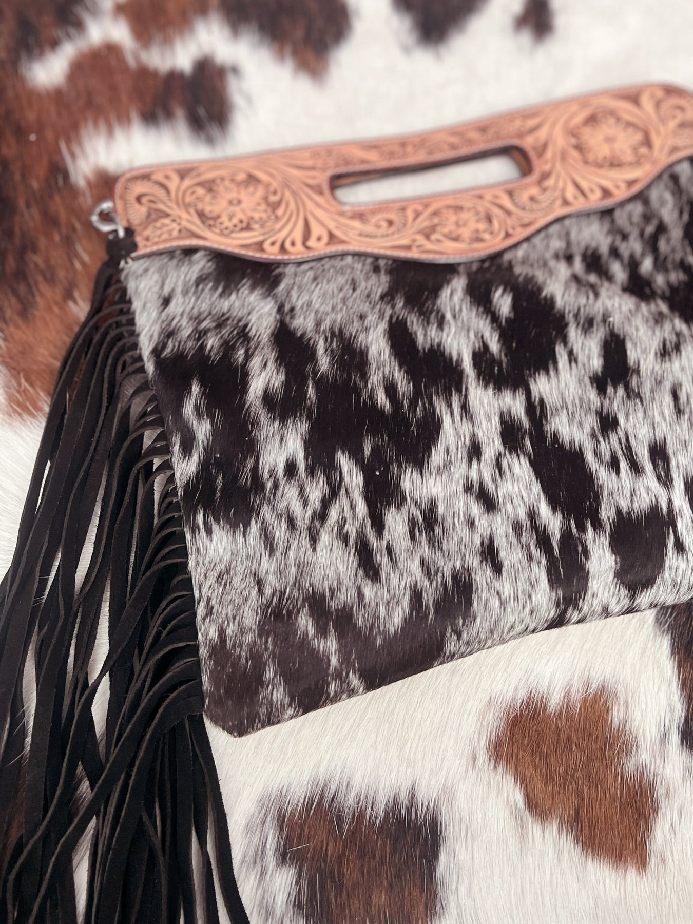 Elevate your style with the Holstein Heaven Clutch Bag. This versatile bag is made from high-quality hair on hide and features a unique black fringe detail. With a convenient clutch/crossbody design and a tooled strap, this bag effortlessly combines fashion with functionality. Add a touch of western flair to any outfit with this must-have accessory.