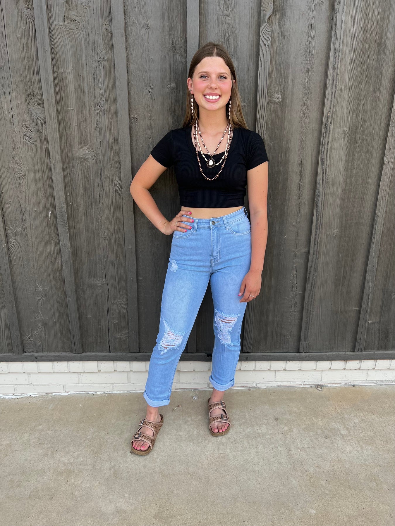 Be the definition of effortless style with the Perfectly Balanced Denim. These high-waisted mom jeans feature shredded knee holes and a distressed hem, plus a button closure and zip fly. Rock 'em with a tucked-in blouse and statement earrings for a look that won't even break a sweat! Five pocket styling, high rise light wash denim—it's jeans perfection!