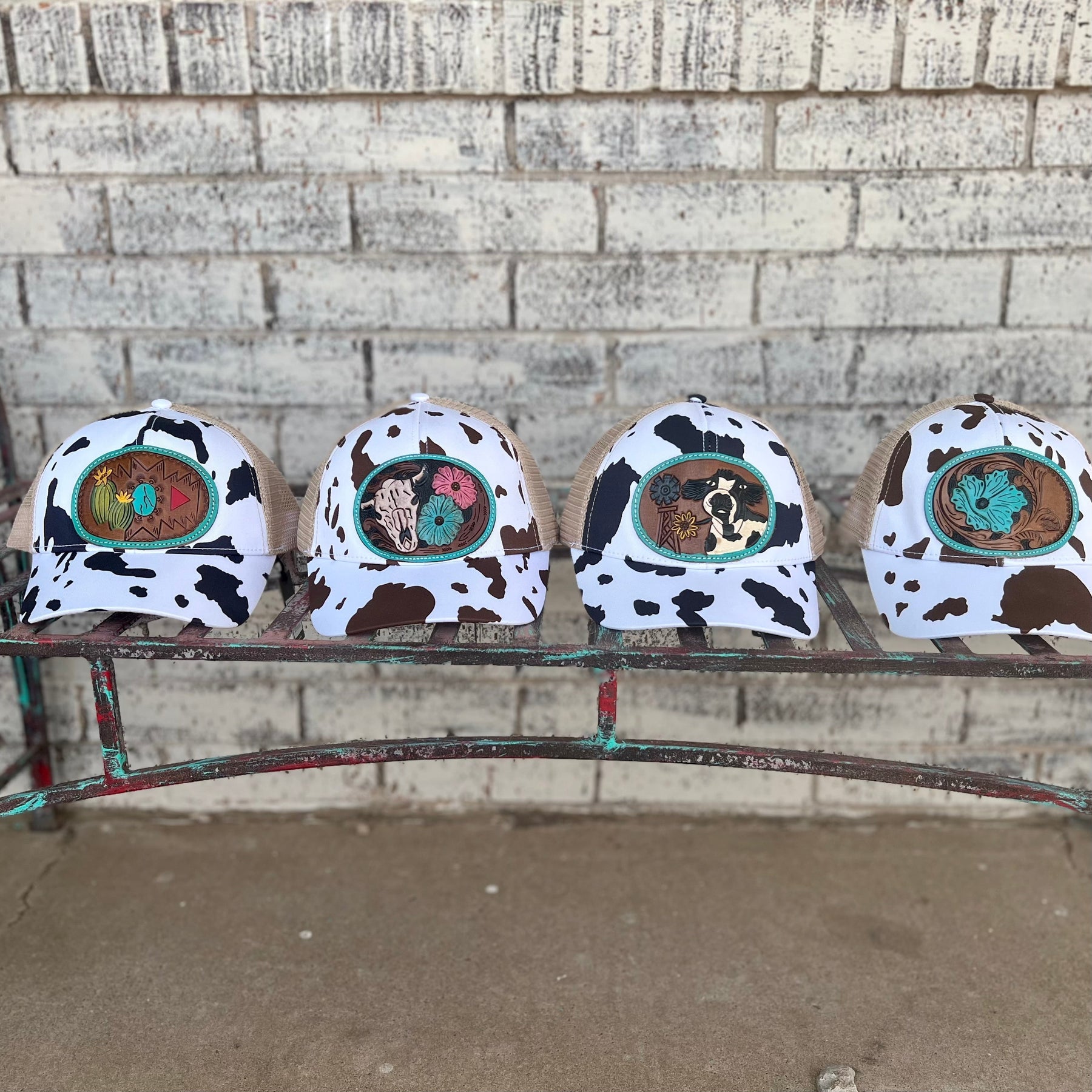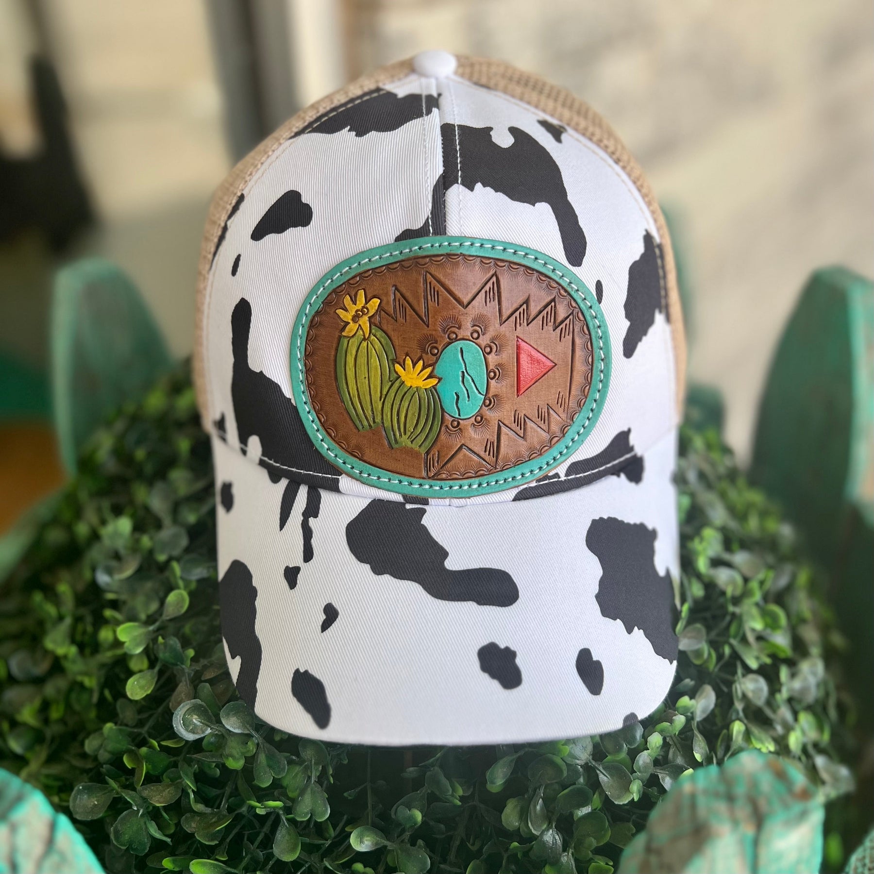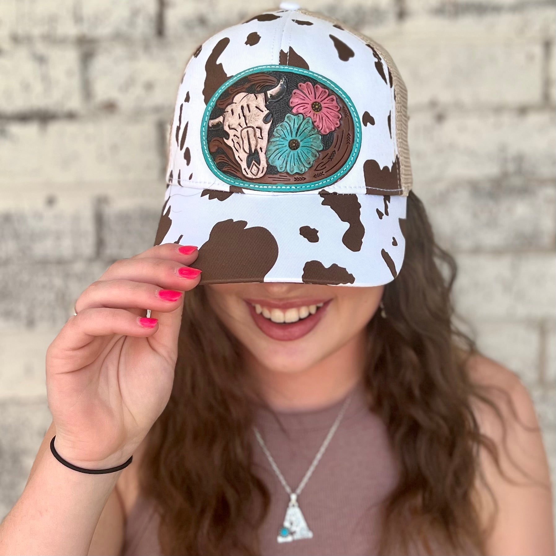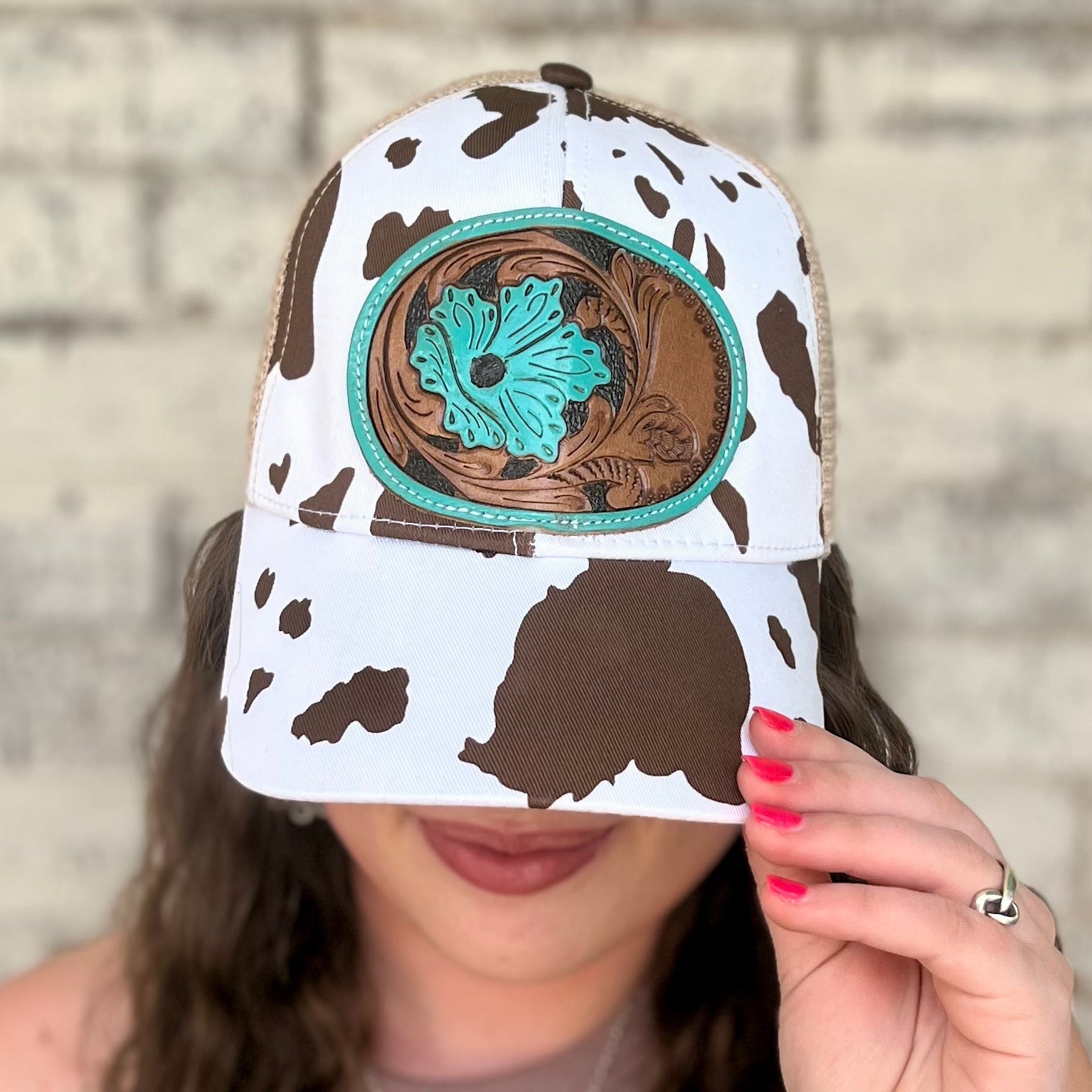 This Myra tooled leather ball cap is the perfect way to spice up your western style! With a cow print bill and a tooled leather design, you'll be the envy of the rodeo. Look sharp in style – Yee-haw!
