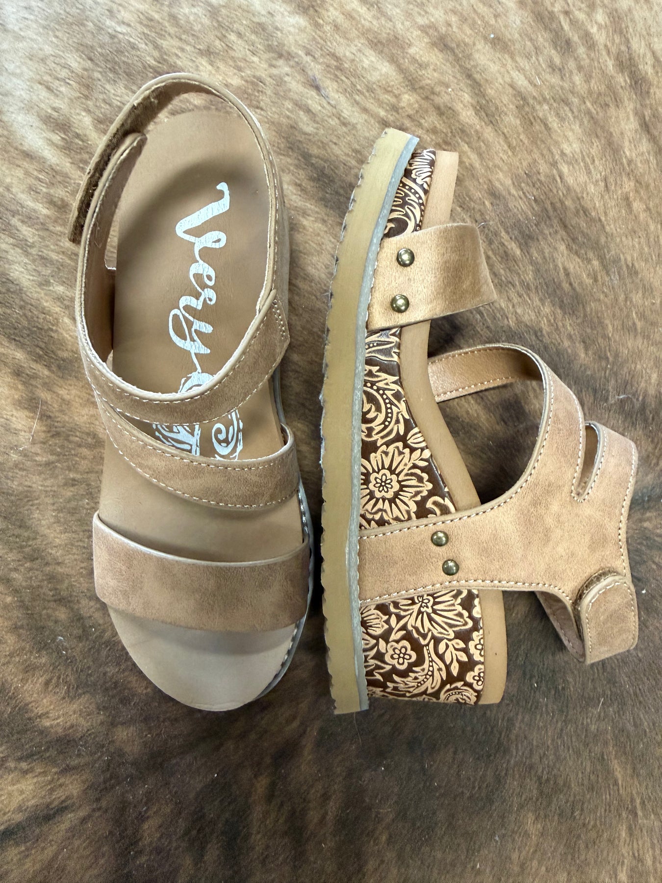 Step into effortless style with the Very G Nude Verde Trail Wedges. These strappy sandals feature a comfortable 2.5" wedge heel with eye-catching tooled leather detailing that adds personality to any outfit. The secure velcro ankle strap keeps your foot locked in place, while the cushioned footbed ensures all-day comfort. Perfect for casual outings, weekend adventures, or everyday wear.