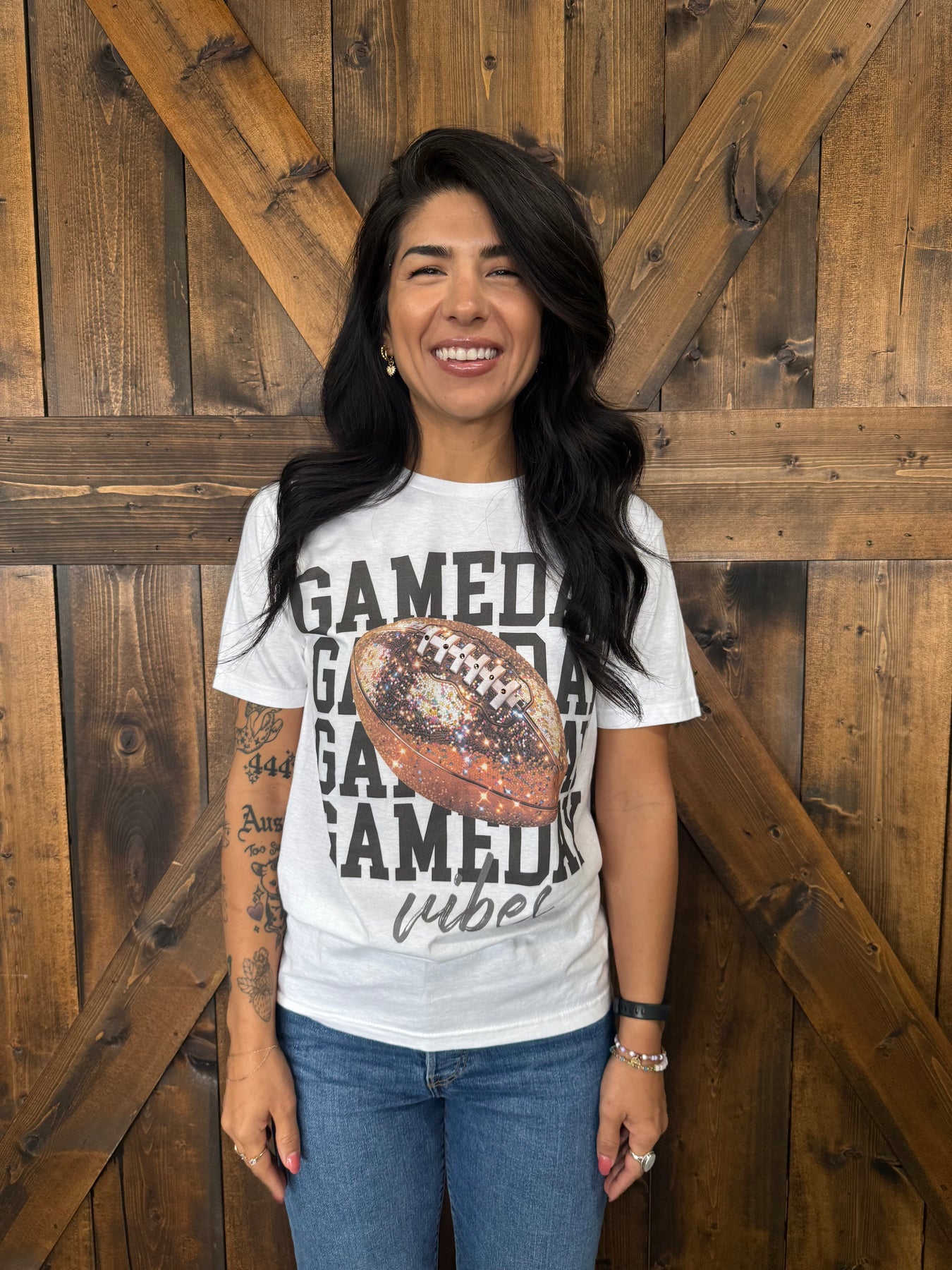 Get ready to sparkle on game day in this white crewneck tee! Adorned with a fun football graphic and "Game Day Vibes" text, it features eye-catching rhinestone details that add just the right amount of glam. The short sleeves keep things breezy and comfortable, whether you're tailgating, cheering from the stands, or just celebrating the season. It's the perfect blend of sporty and sassy.