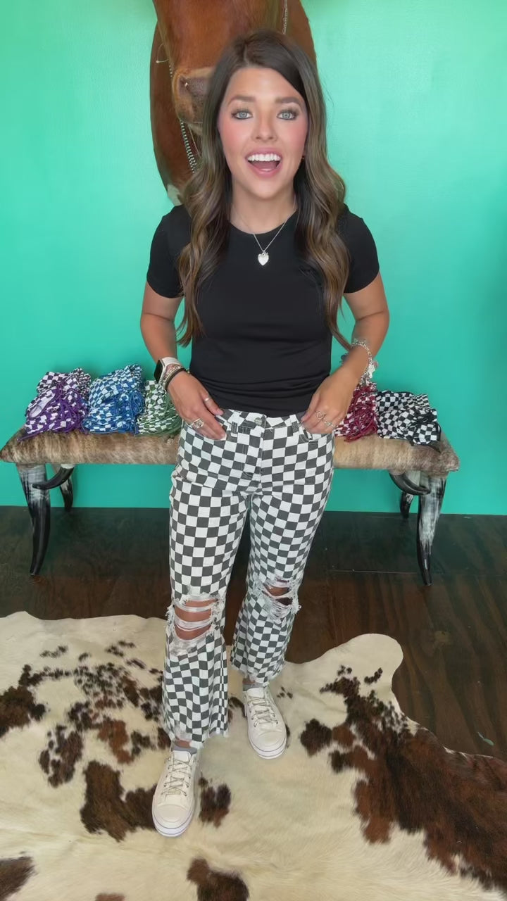 Stand out effortlessly with the Round The Track Jeans, featuring a distinctive faded black and white checkered pattern and stylish distressed holes at the knees. Designed to combine bold fashion with comfort, these jeans are the perfect choice to upgrade your wardrobe and showcase your confident, trend-savvy side.