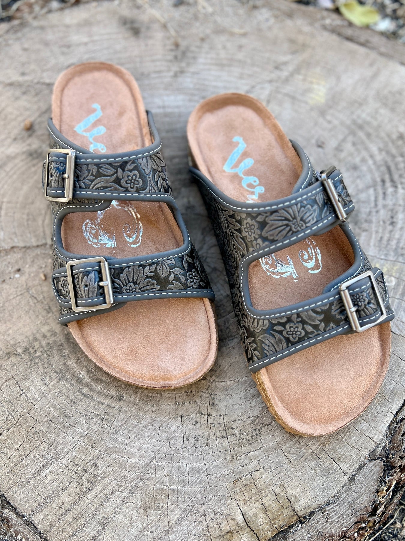 Treat your feet to a touch of luxury with these Berry Comfort Grey Sandals! Featuring a double strap and a intricately tooled floral pattern, these stylish sandals will step up any outfit - not to mention their super comfort! Slip into these dark grey leather gems and make heads turn!