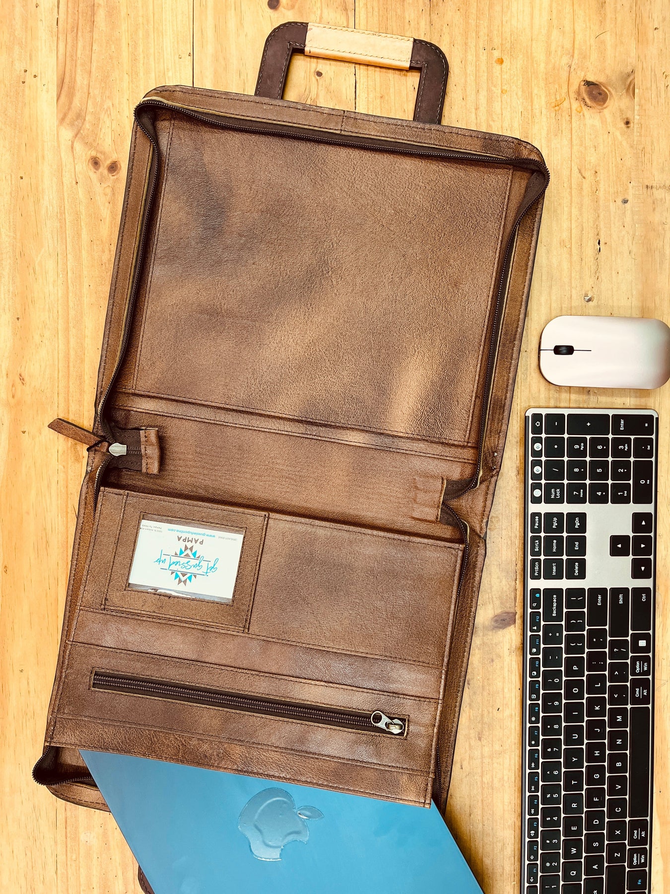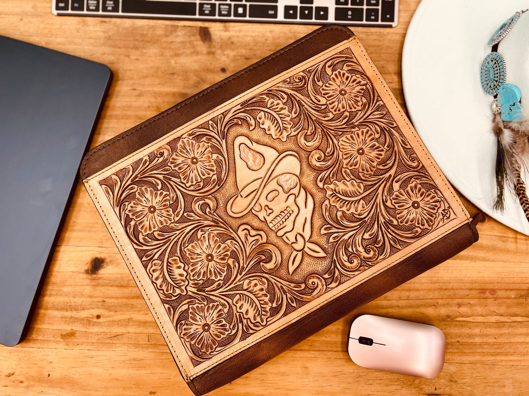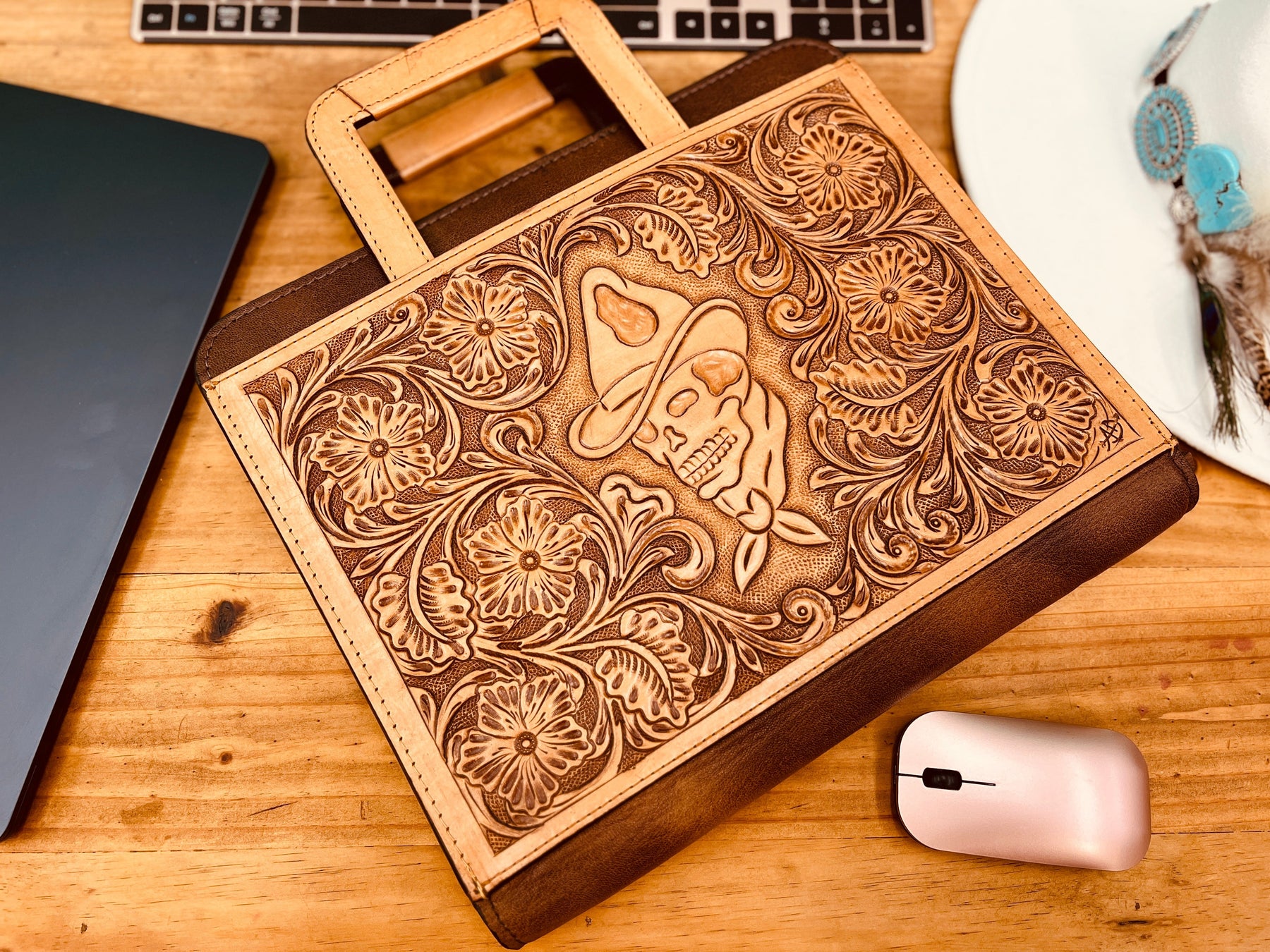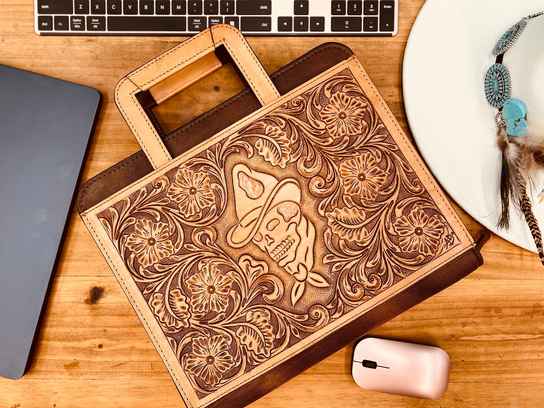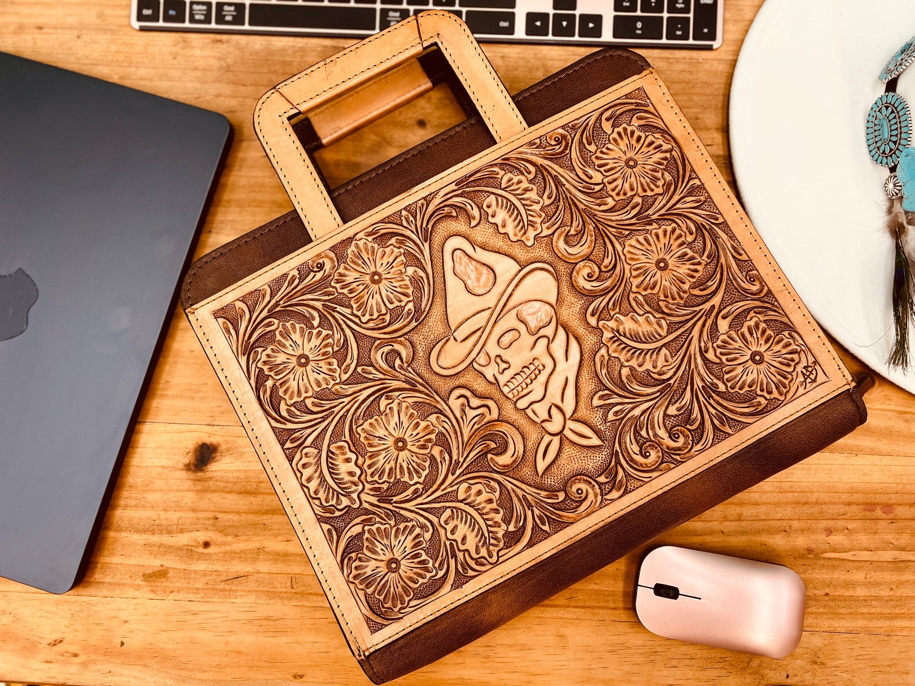 Elevate your business western style with our Darlin' Dead In His Tracks Portfolio. Crafted with high quality and durable leather, this hand tooled portfolio features a western outlaw style skull design. The retractable handles make it easy to carry, while the multiple interior pockets and storage slots, pen slot, card slots, and zipper closure keeps you organized on the go. Make a statement at your next meeting with this professional carrying case. Unisex.