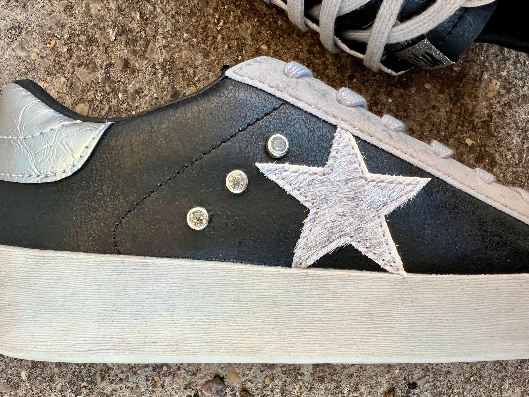 These Wayne Brady sneakers exude timeless style and offer the perfect mix of sophistication and edge. Crafted from a luxe smooth black faux leather, grey suede-like material adorned with a hair-on-hide star, and glinting rhinestone studs, these shoes will add a stylish touch to any casual ensemble. Subtle yet striking, the classic black body is accented with silver metallic on the heel and grunge-effect soles.