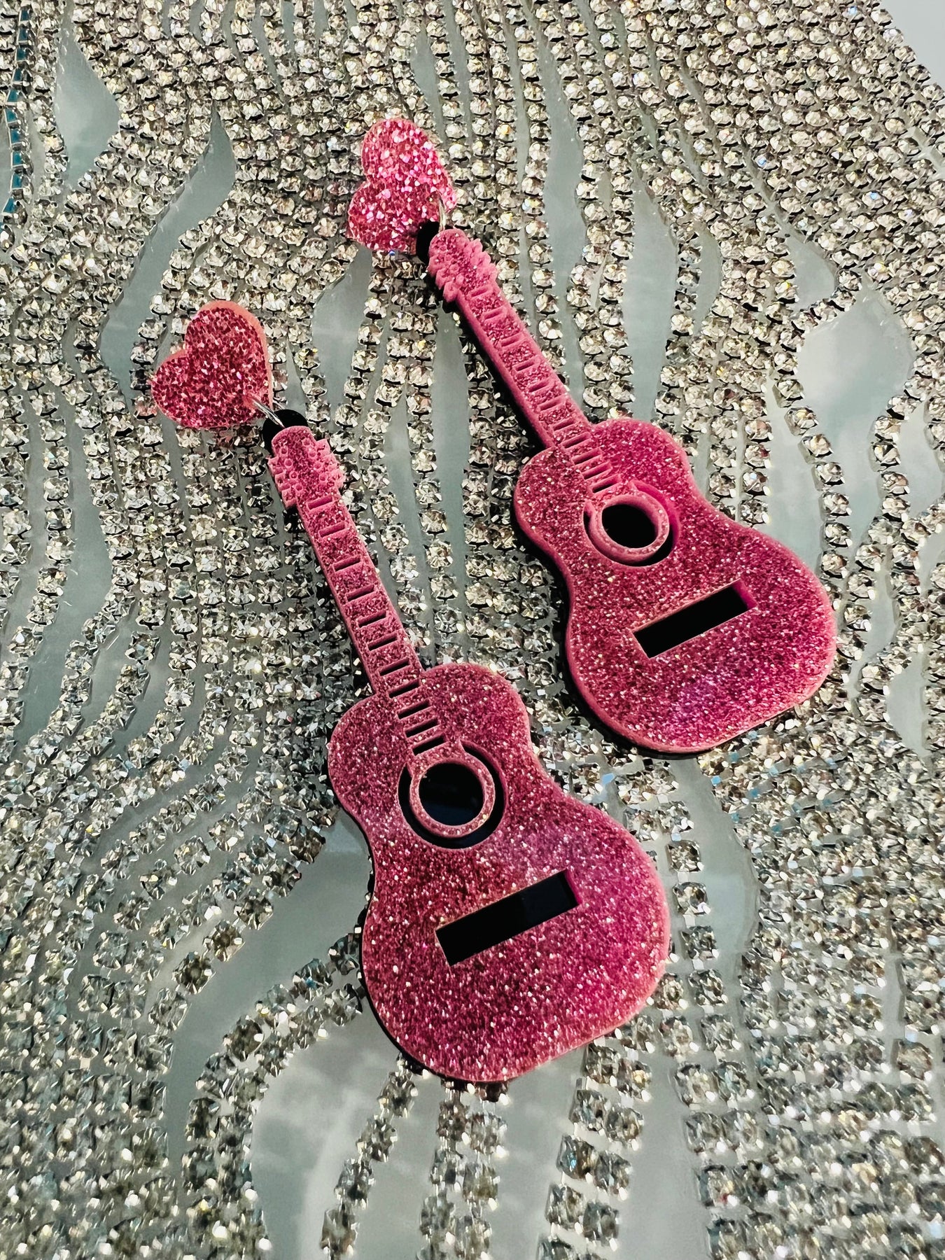 Transform your look with these cool Let's Rock N Roll Girls Earrings! These 3" danglers boast an acoustic guitar in pink glitter with a post back. So rock up your style with these earrings and let the world know you're here to stay! 🎸